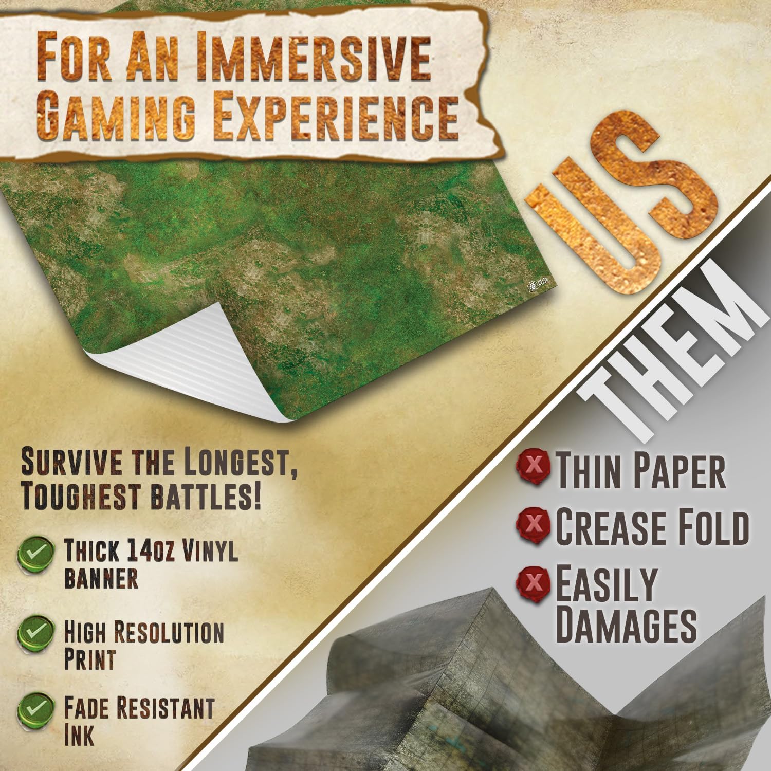 - ENRICH YOUR GAMING EXPERIENCE - A heavy-duty gaming mat, made to handle plenty of epic journeys and battles! Transform your tabletop or gaming surface quickly and easily with our battle gaming field mat. Each mat is carefully crafted with detailed terrain making it a valued addition to your next quest!