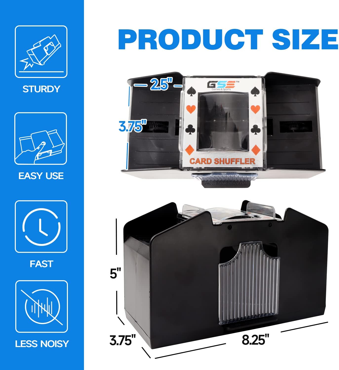 - Automatic Card Shuffler: Just insert the cards into the two openings, and press the switch at the bottom of the card shuffler, with the machine shuffling quickly and efficiently; shuffles one to four of decks playing cards in seconds, save your time; the shuffler dimensions are 8.25" L x 3.75" W x 5" H