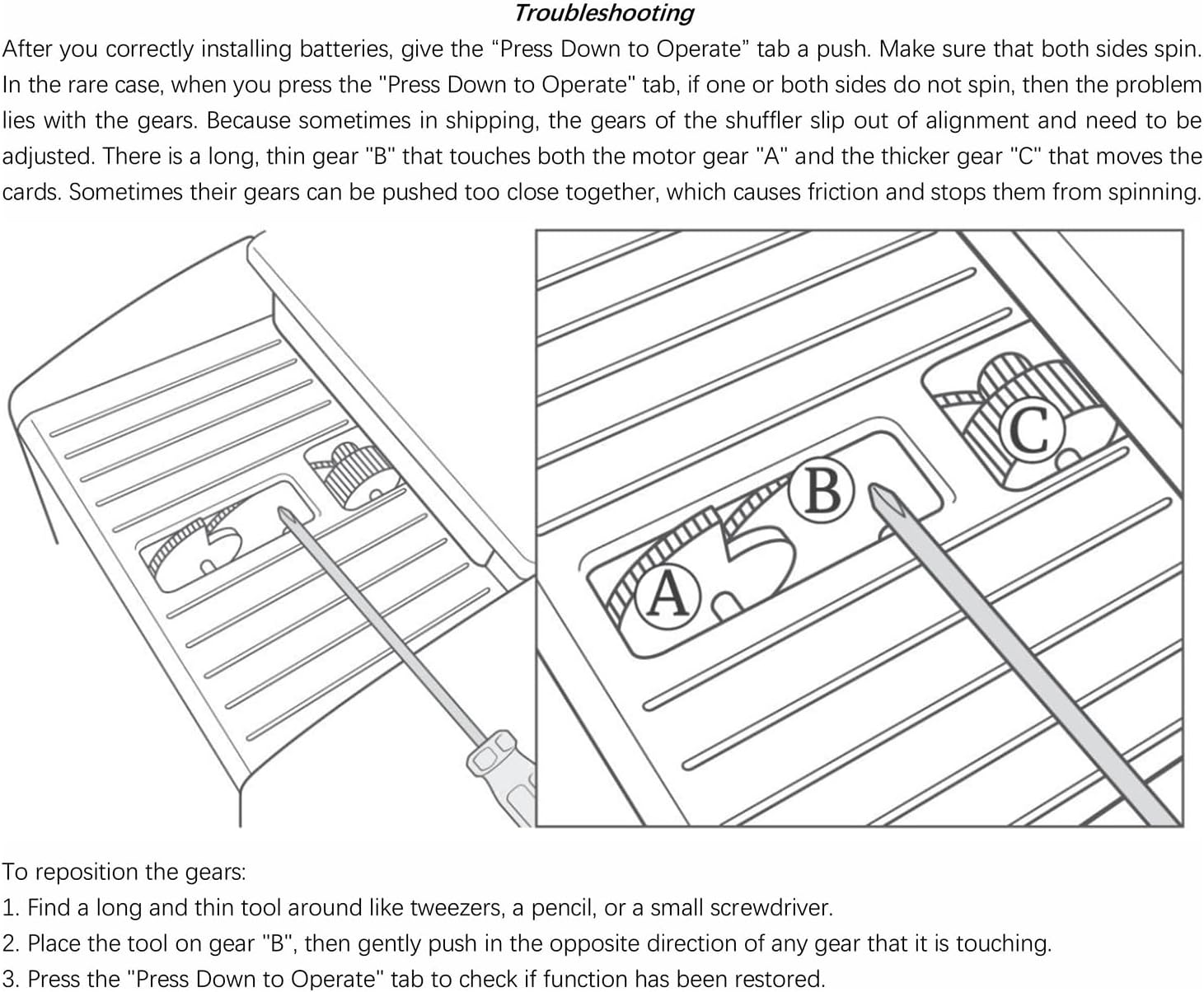 - Important Tip: The card shuffler requires four C batteries if you use batteries to operate ( batteries not included); flat cards and new cards work great, bend cards or old cards may not work (playing cards are not included)