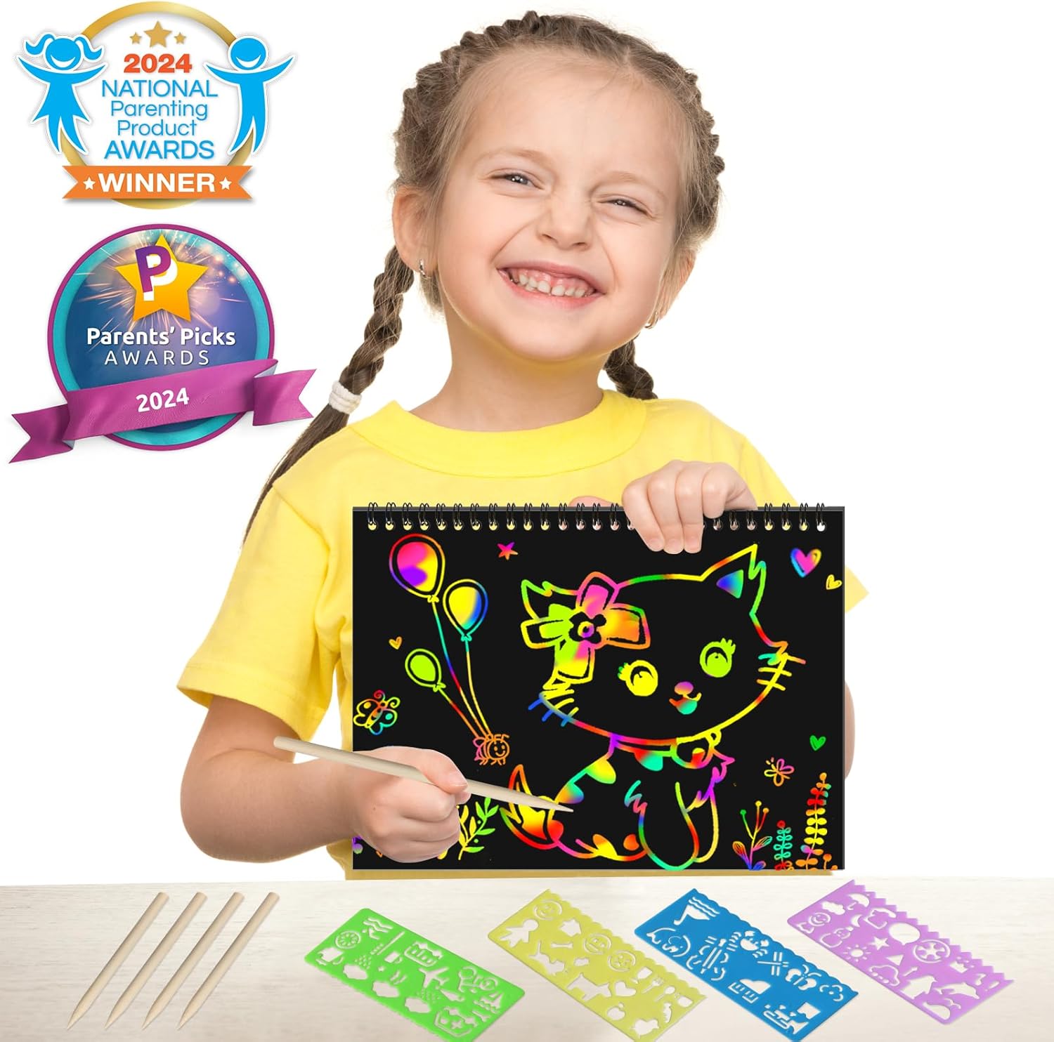 - Magic Rainbow Scratch Books: Include 20 spiral-bound pages & 4 styluses & 4 drawing stencils in scratch paper sets. The underlying color is bright, which is a great contrast to the black scratch-away material. Large art paper create a full size creation and your favorite patterns freely