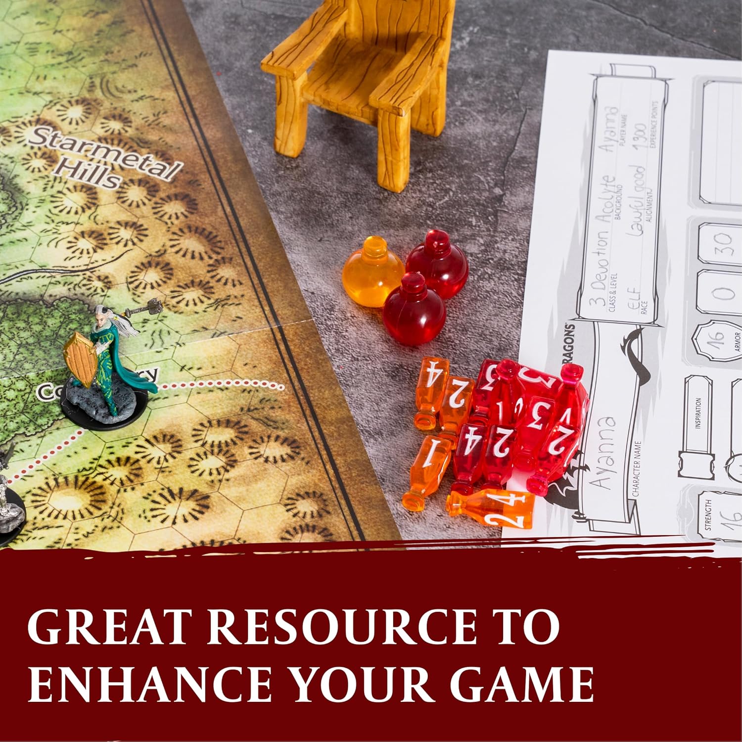 - EASILY KEEP TRACK OF YOUR HEALING POTIONS: Gone are the days of forgetting to use your healing potions in critical moments! With our 15 Healing Potion Tokens you & your fellow players will always be visually reminded of exactly how many of each type of healing potions you have!