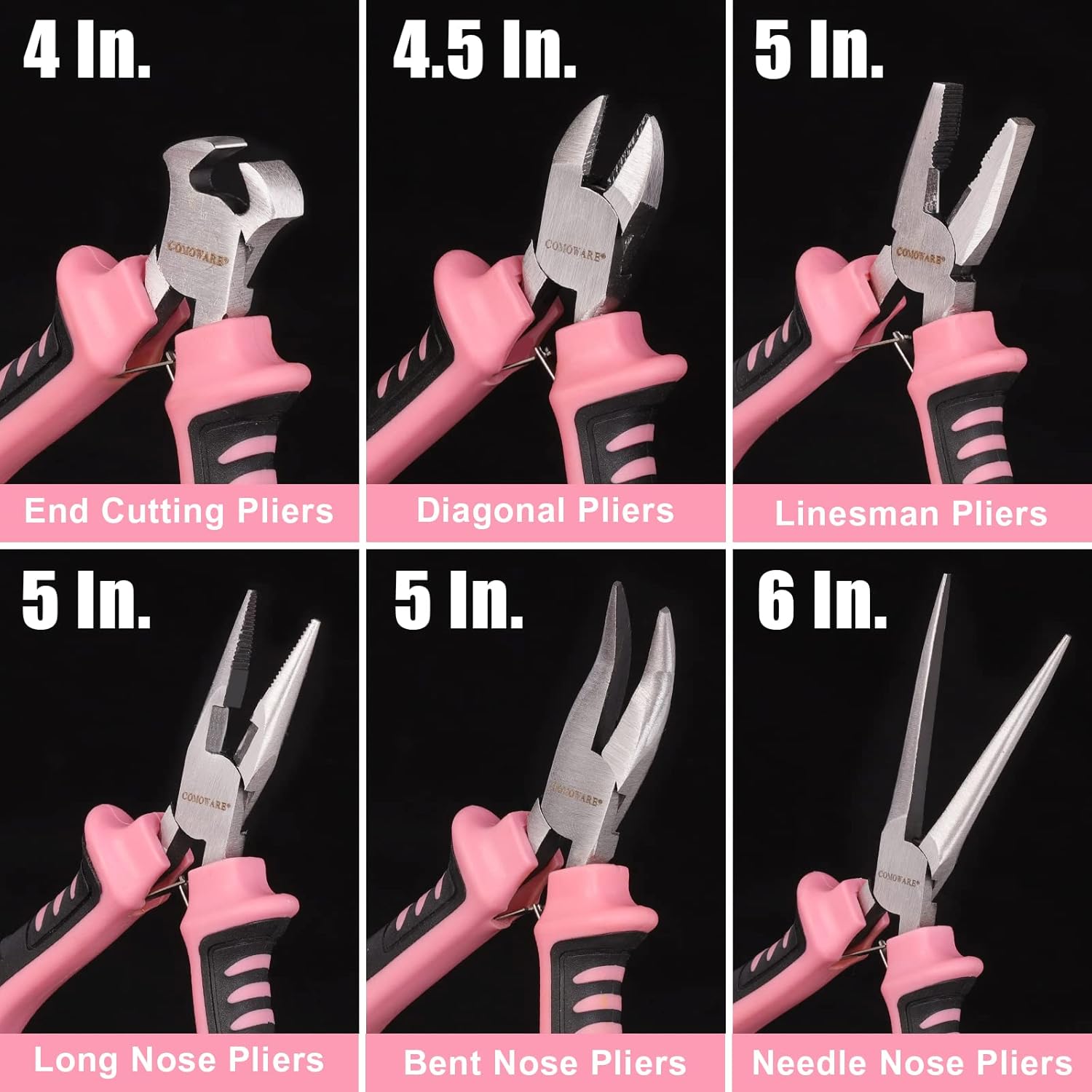 COMOWARE 6-Piece Mini Pliers Set, Needle Nose, Long Nose, Bent Nose, Diagonal, End Cutting and Linesman, for Crafts Work, Electronic Repair, with Pink Pouch