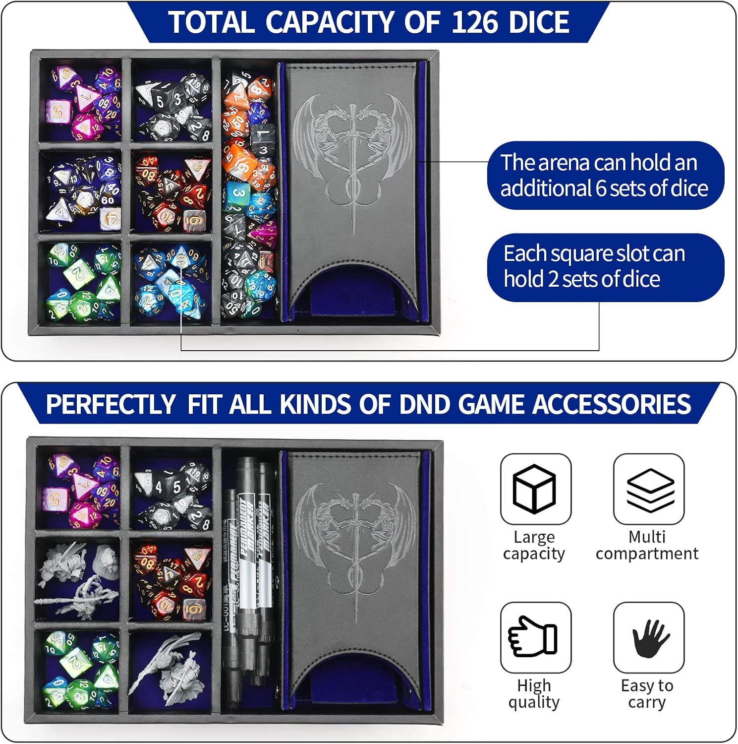 - 【Super Storage Space】- The square slot measures 2" x 2" x 1.5", each slot can hold 2 sets of standard game polyhedral dice or DND miniatures, the rolling area can also hold Erasable marker pens or game dice and other game accessories besides the dice tower