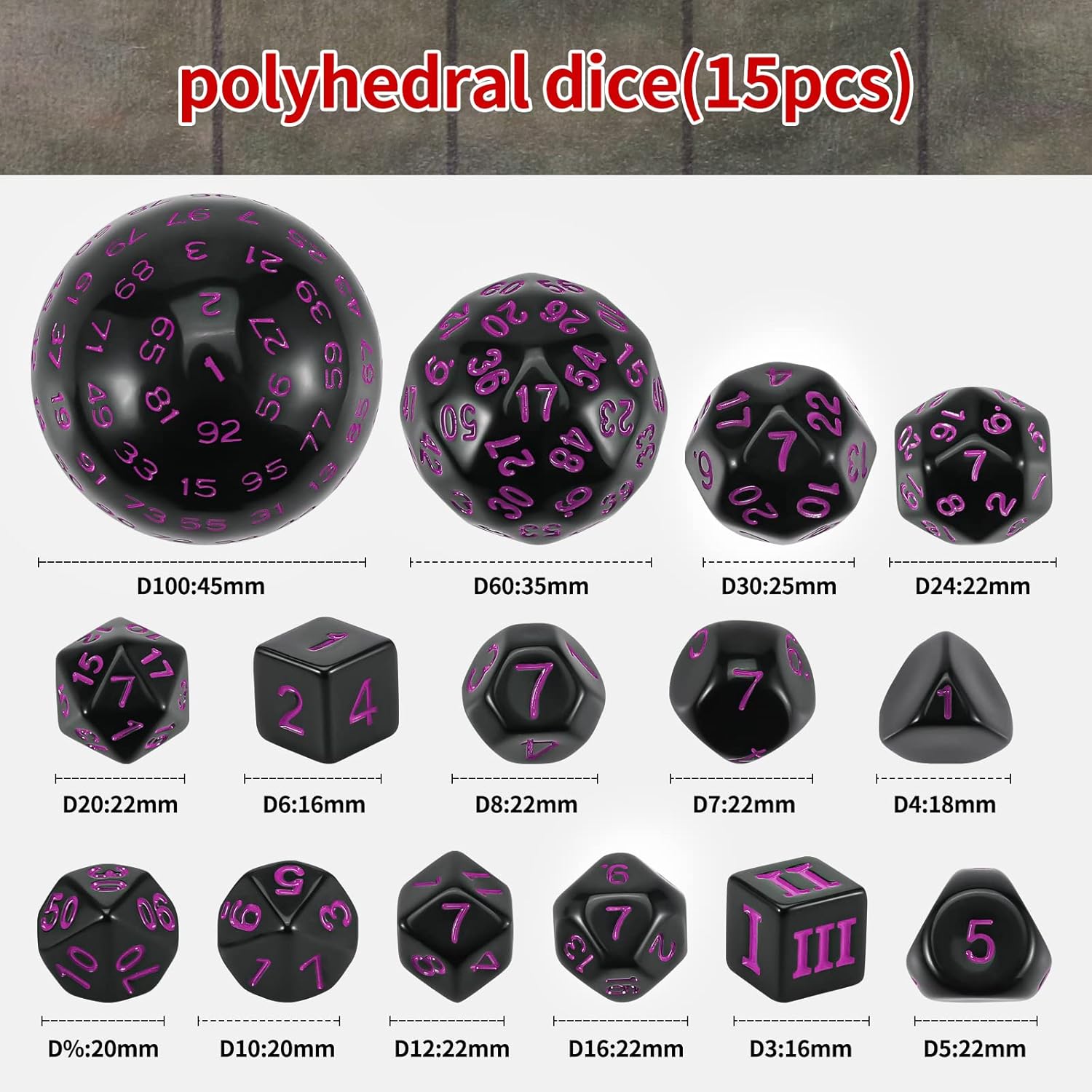 - Super dice set: DND Role Playing Dice (15pcs) from 4 sides to 100 sides, (contains D4,D5,D6,D7,D%,D8,D10,D12,D16,D20,D24,D30,D60 and D100) which can meet all your table game needs.