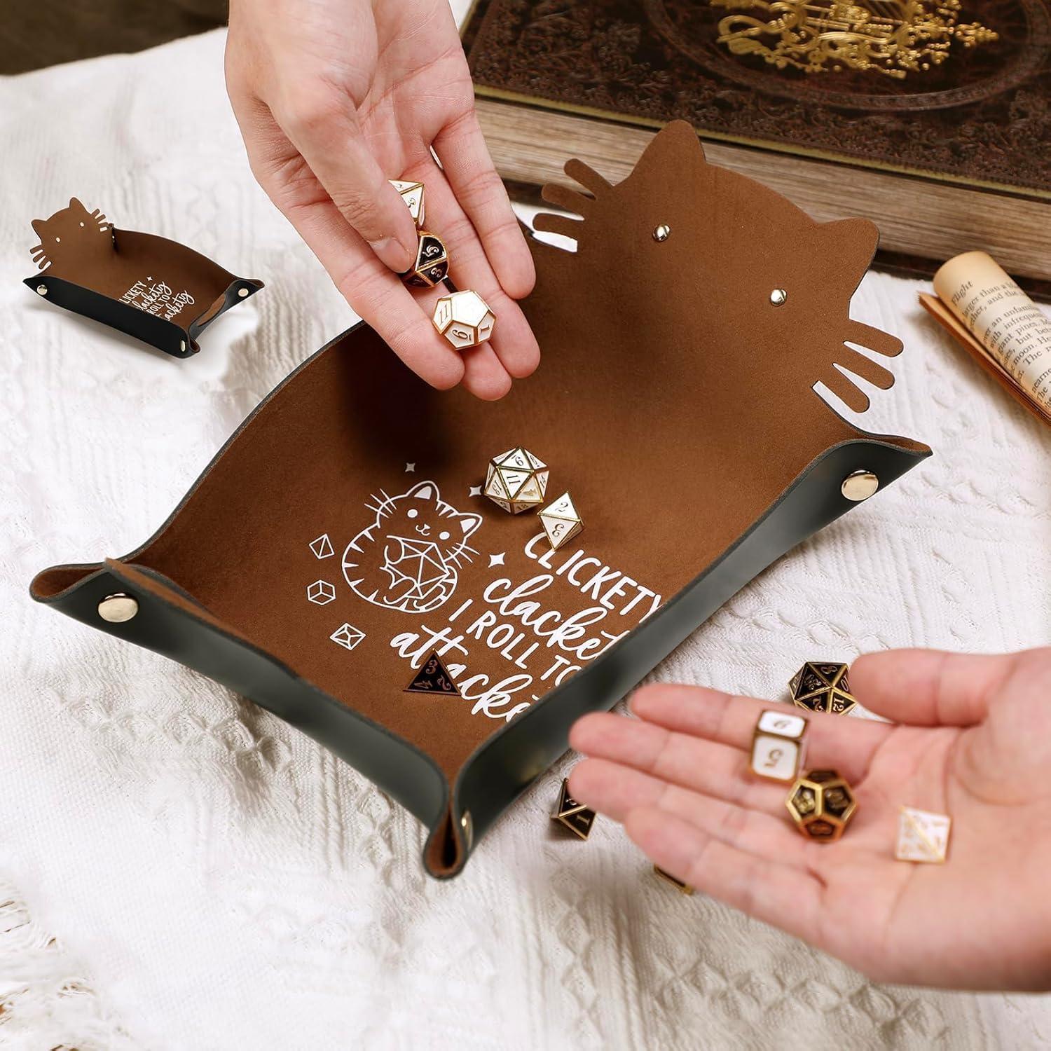 - Widely Use: This adorable cat dice rolling tray can stop dices from rolling off the table or getting lost during gameplay. It also can avoid dices from damaging the playing surface or furnitures. After the game, it can be a holder for anything likes dices, keys, letters and so on.