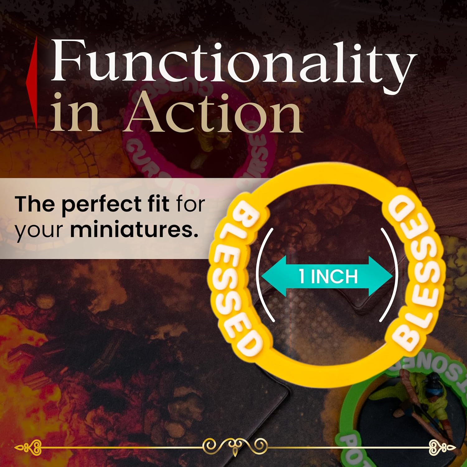 - CLARITY IN CHAOS: Eliminate confusion in the heat of battle with 112 vibrant DND status rings - 4 each of 28 conditions with 2 wildcards for unexpected twists! Excellent 3D visibility from any angle.