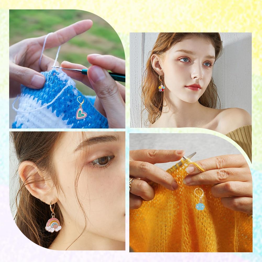 - [1 BOX 1 LOOP 20PCS STITCH MARKER]: There are 20pcs knitting stitch markers on a large metal ring, which can help you store these cute stitch markers and keep them tidy at all times. The upgraded large leverbacks makes the use of the knitting charm more convenient, making it a truly convenient crochet tool.