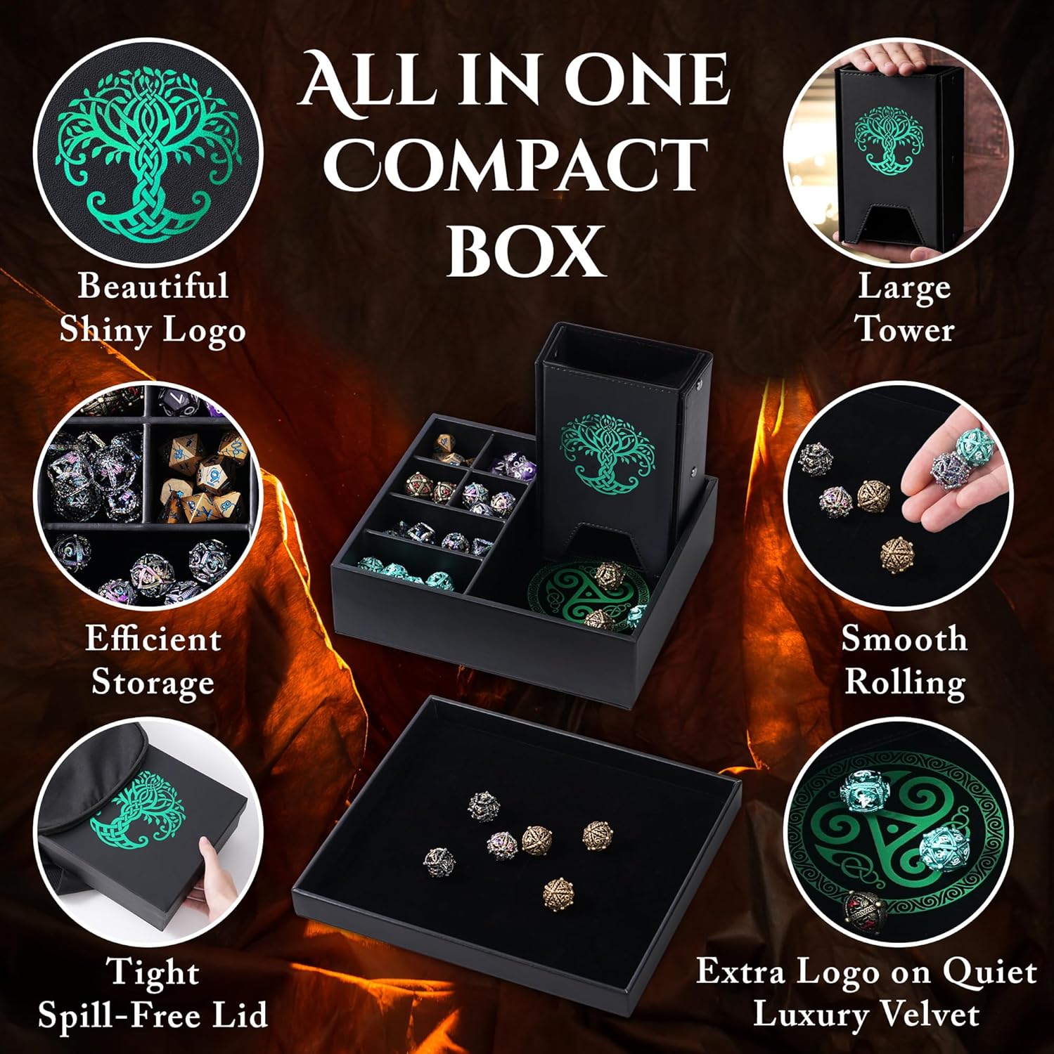 - LARGE TOWER, QUIET RANDOM ROLLS: Our distinctively larger tower ensures random rolling and stability (even for larger metal dice), and reduces the jamming issues that smaller towers often encounter. The soft black velvet felt lining in the tower and tray safeguards your dice for safer, quieter rolls