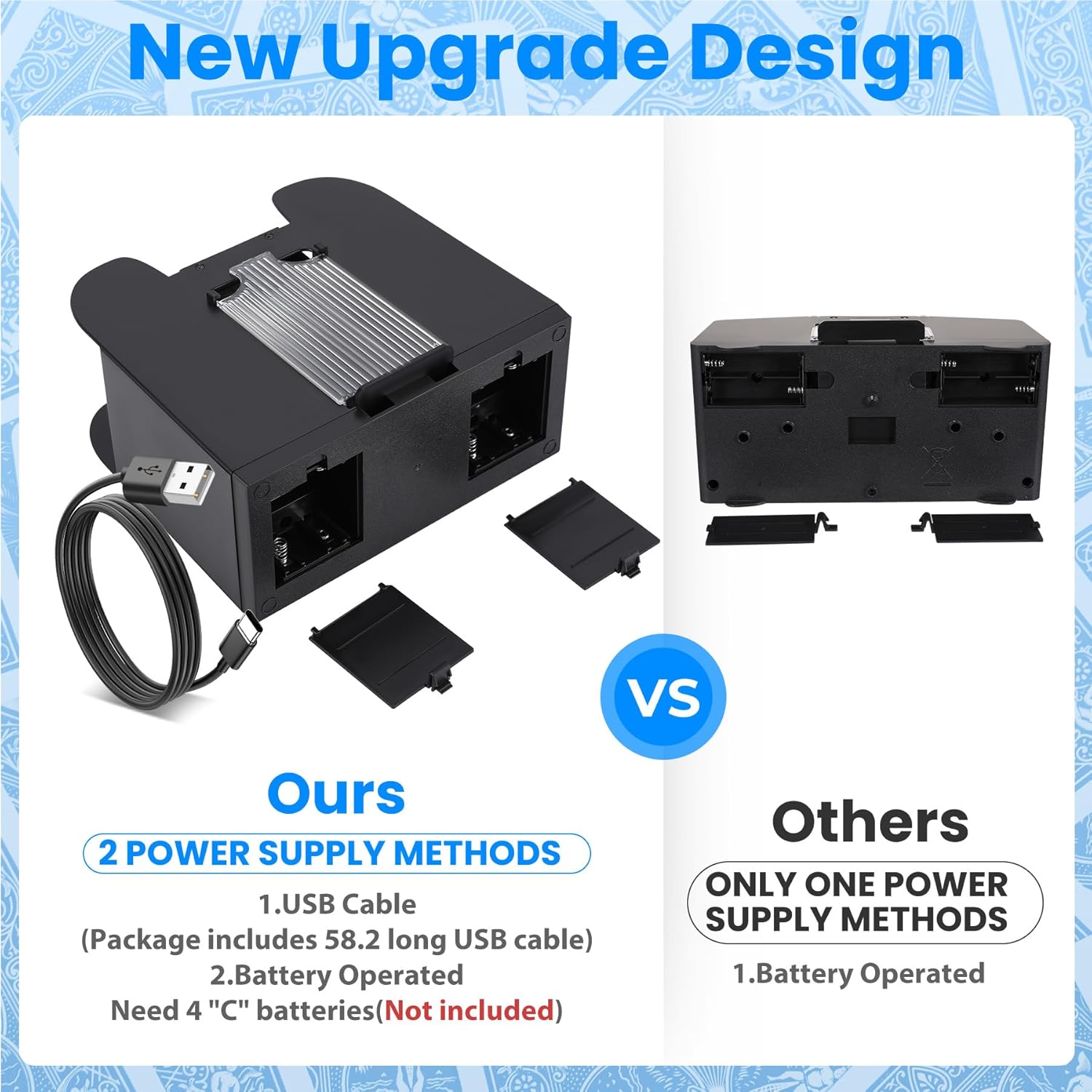 - Two Power Supply Choices-USB and Battery: Lineba card shuffer has a USB-C interface: connect the card shuffler's power cord (Power Cord Included) to any USB port that can provide a 5V power supply, and you can start using it immediately. The shuffler also still includes the 4 C battery power method ( Batteries Not Included ), so you can flexibly choose which method to use according to your needs