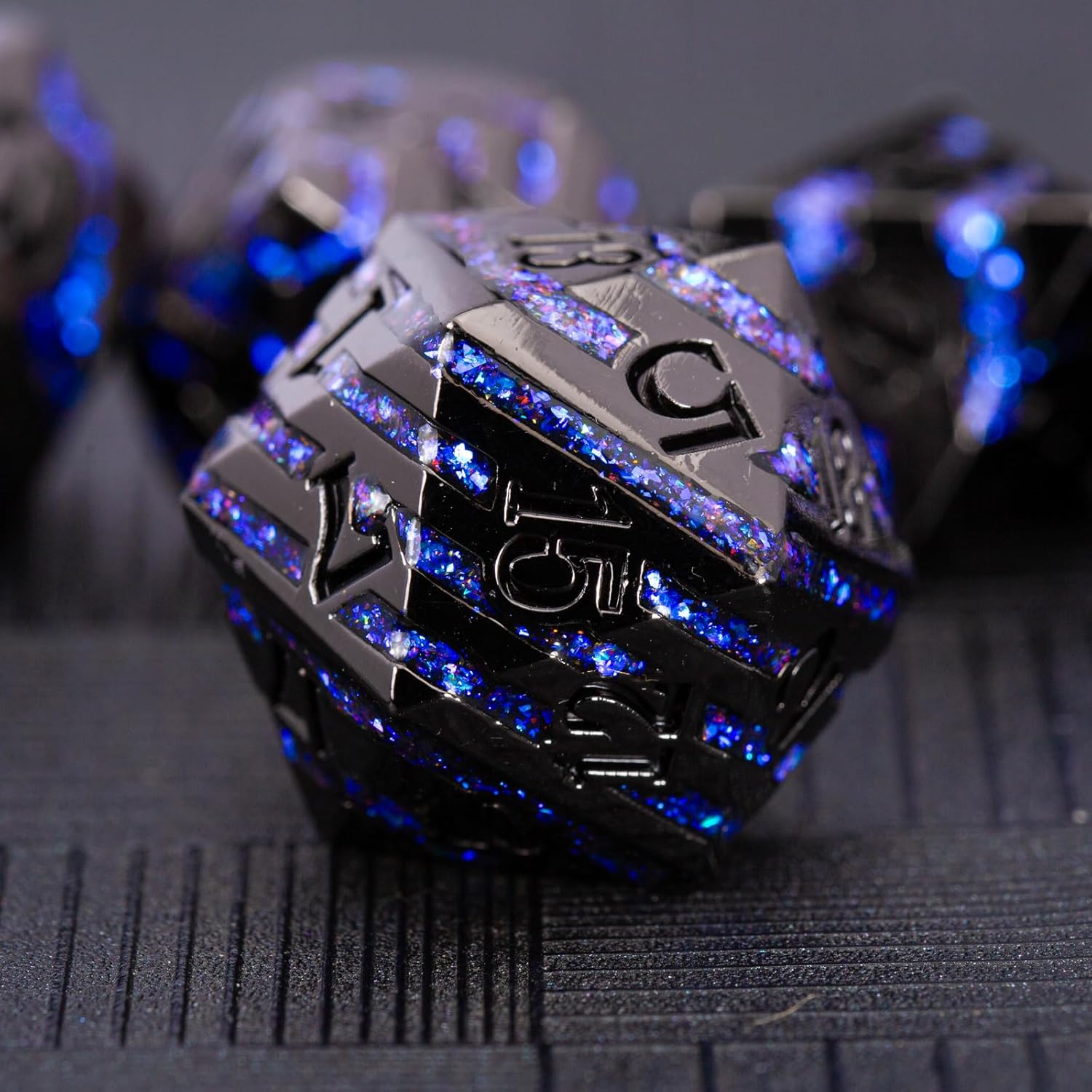 Metallic Glitter Stripes D&D Dice Set,7 PCS Polyhedral Dice with Gift,RPG Metal Dice Set Dungeons and Dragons Tabletop Game (Black Nickel Sapphire Blue)