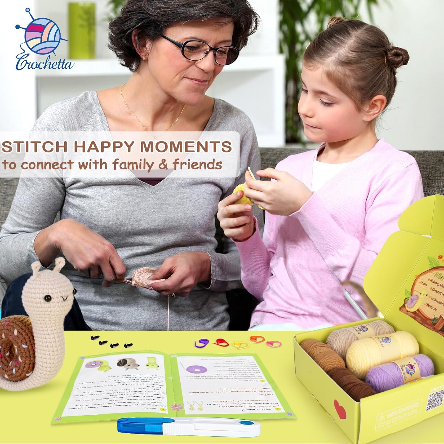 - All-In-One Crochet Kit : Our beginner crochet kit equipped with everything you need to start: 8 different colored yarns, ample stuffing, a needle, 4 safety eyes, 5 marker buckles, 2 crochet hooks, a pair of scissors, a crochet donut snails pattern, and a beginner's basic crochet manual.