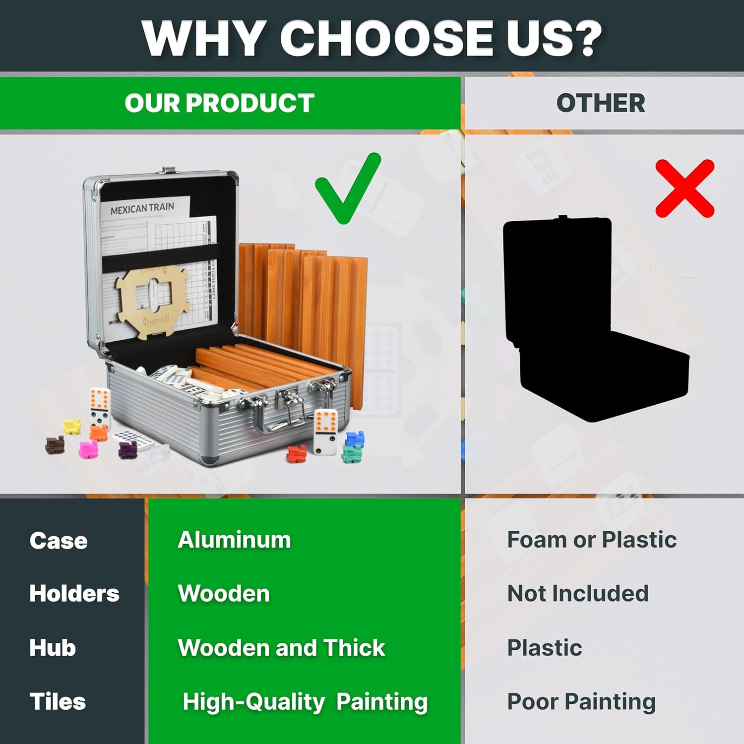 - Mexican Train Set Included: 8 Wooden Tile Holders and Hub, 136 Tiles, 9 Plastic Trains, Score Pad, Instruction, and Aluminum Carrying Case