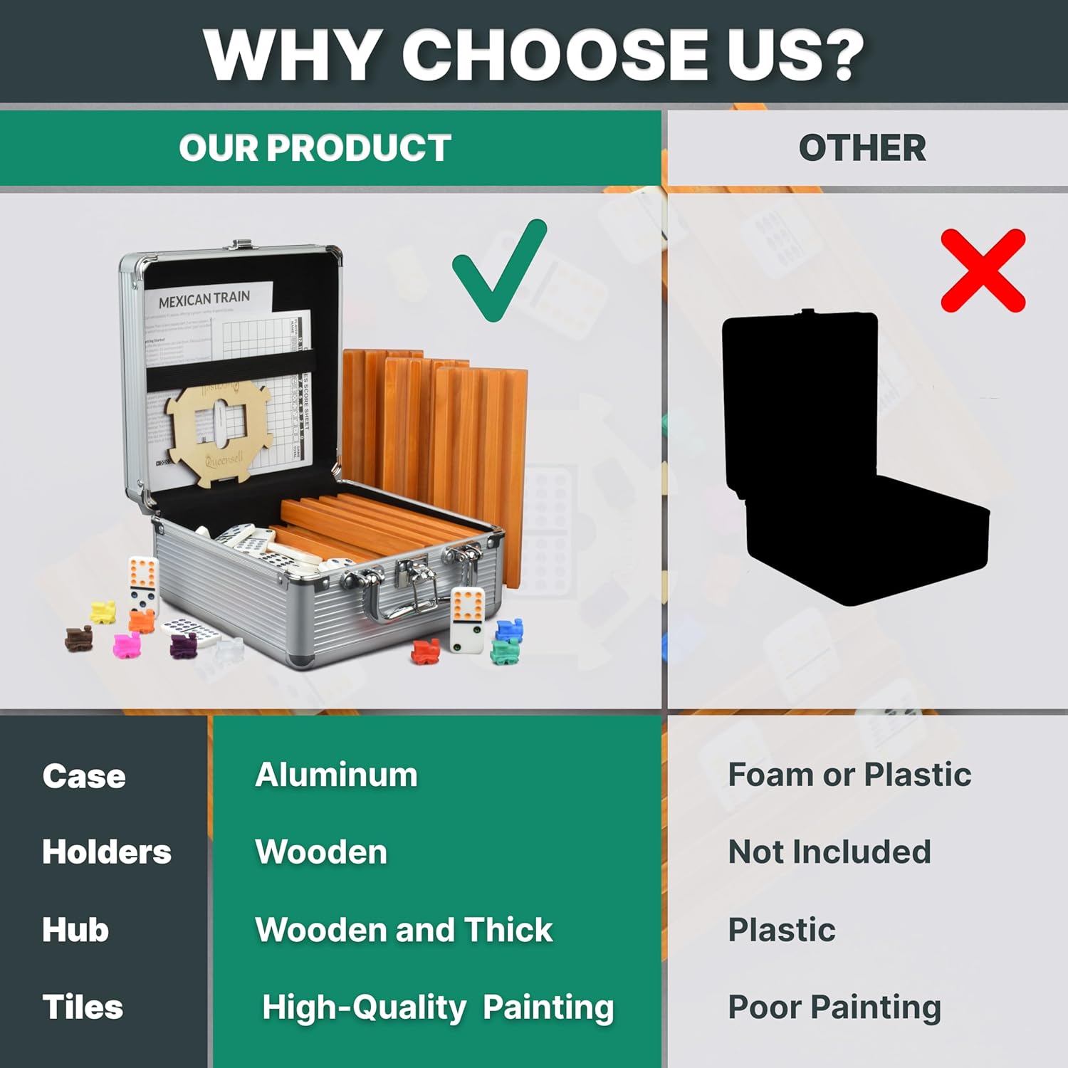 - Mexican Train Set Included: 8 Wooden Tile Holders and Hub, 91 Tiles, 9 Plastic Trains, Score Pad, Instruction, and Aluminum Carrying Case