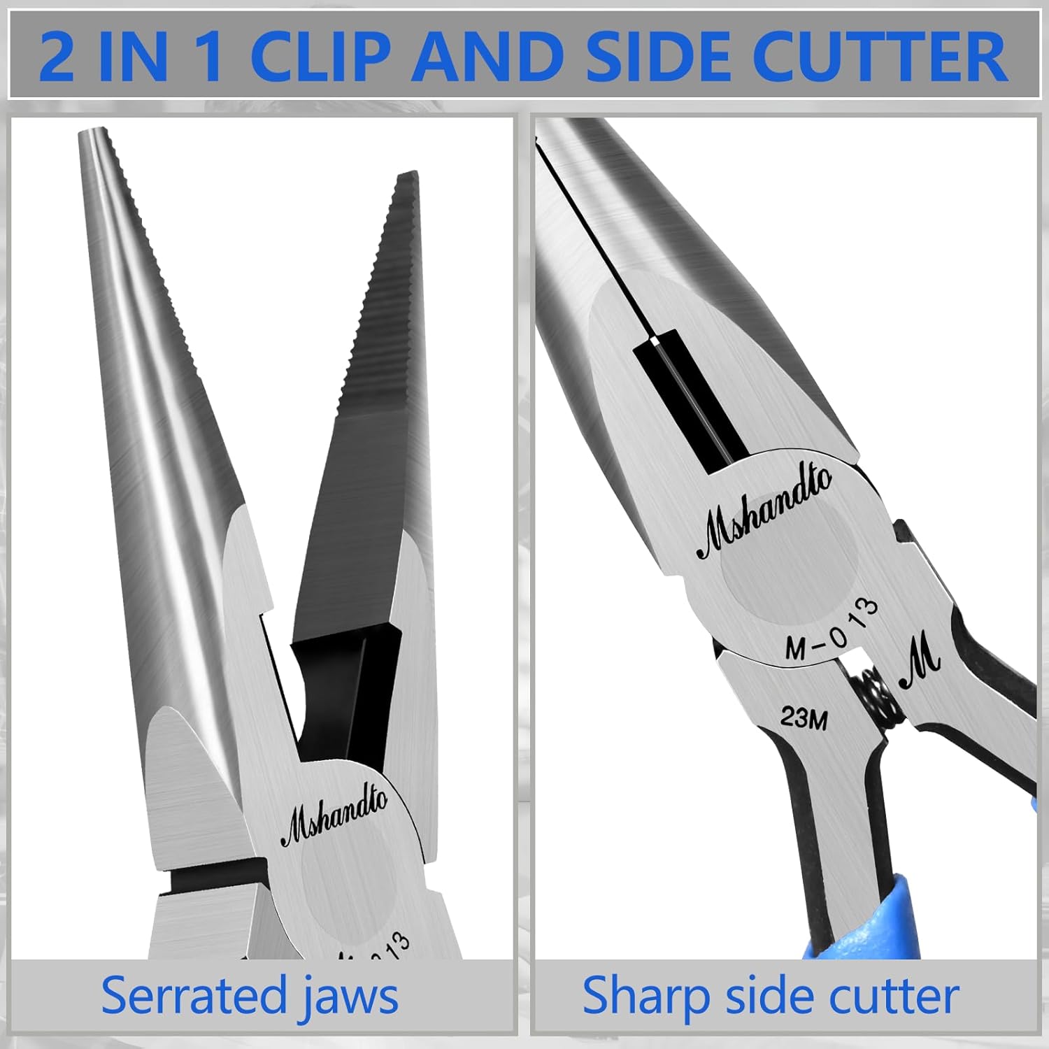 - 🛠Premium Materials: This needle-nose plier is crafted from strong high carbon steel, treated at high temperatures for high strength jaws that won't easily warp. They're also coated in an anti-rust material to prevent corrosion and extend their lifespan