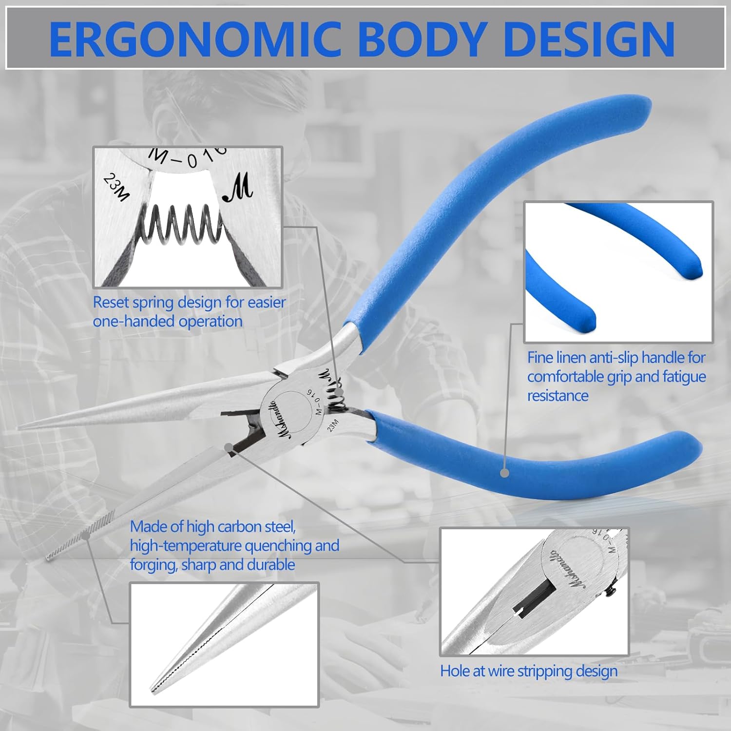 - 🛠Premium Materials: This needle-nose plier is crafted from strong high carbon steel, treated at high temperatures for high strength jaws that won't easily warp. They're also coated in an anti-rust material to prevent corrosion and extend their lifespan