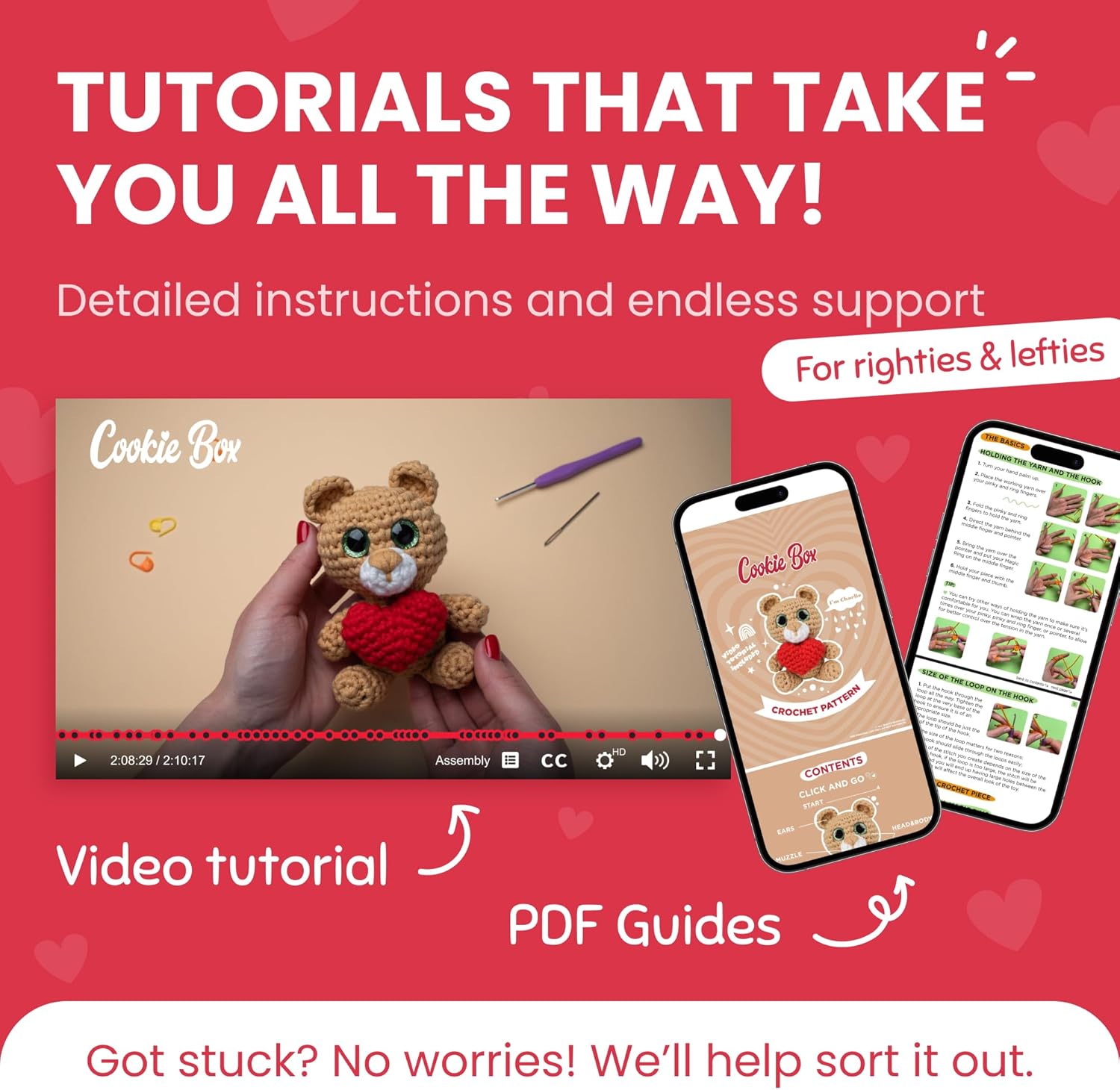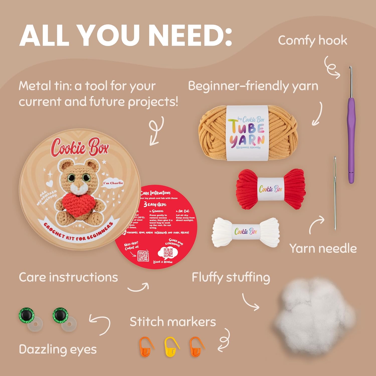 Cookie Box Crochet Kit for Beginners β Gift Set to Make Bear Charlie Amigurumi Plushie β Easy DIY Crochet & Knitting Starter Kit with Video and PDF Tutorials