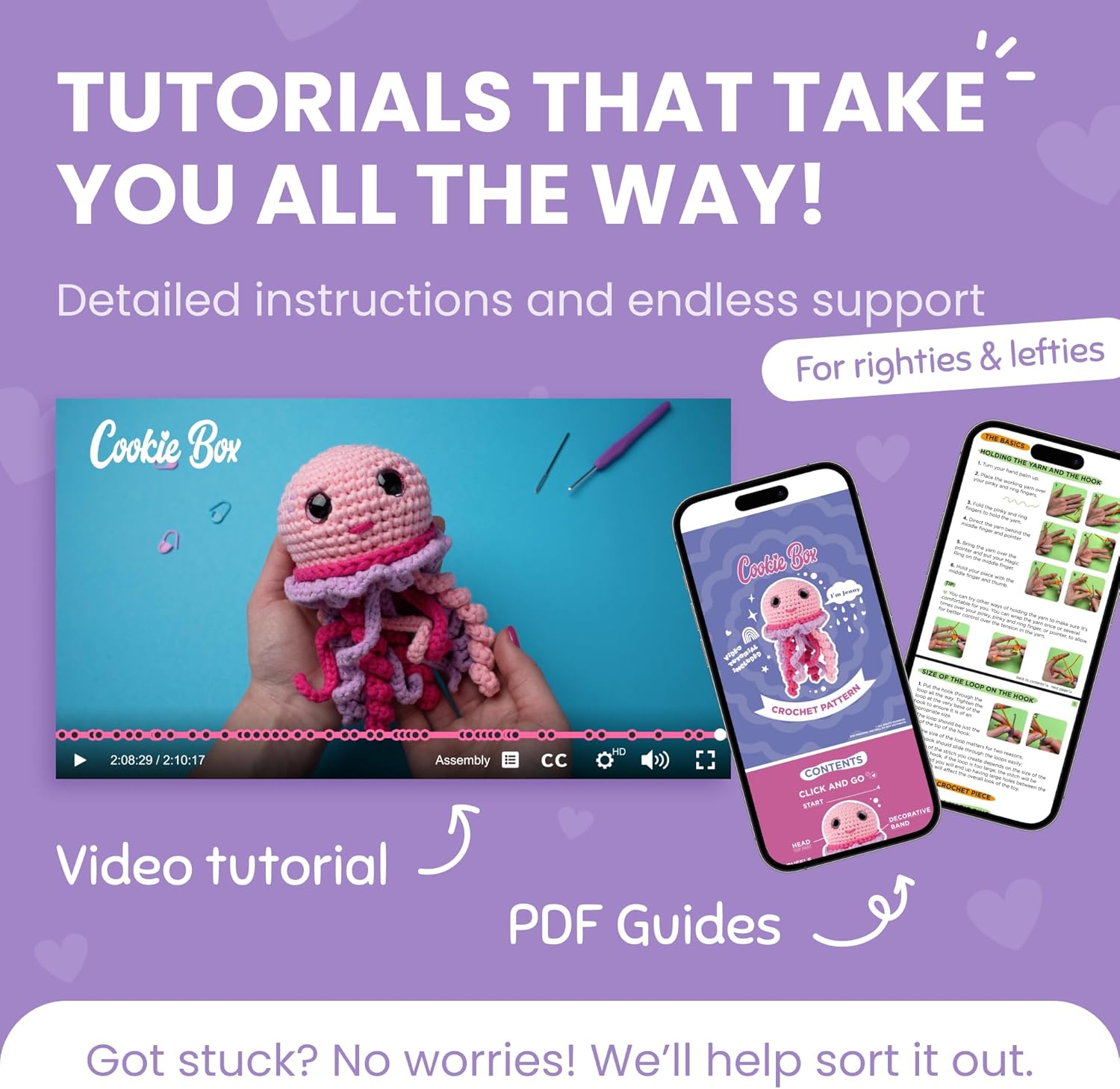 Cookie Box Crochet Kit for Beginners β Gift Set to Make Jellyfish Jenny Amigurumi Plushie β Easy DIY Crochet & Knitting Starter Kit with Video and PDF Tutorials