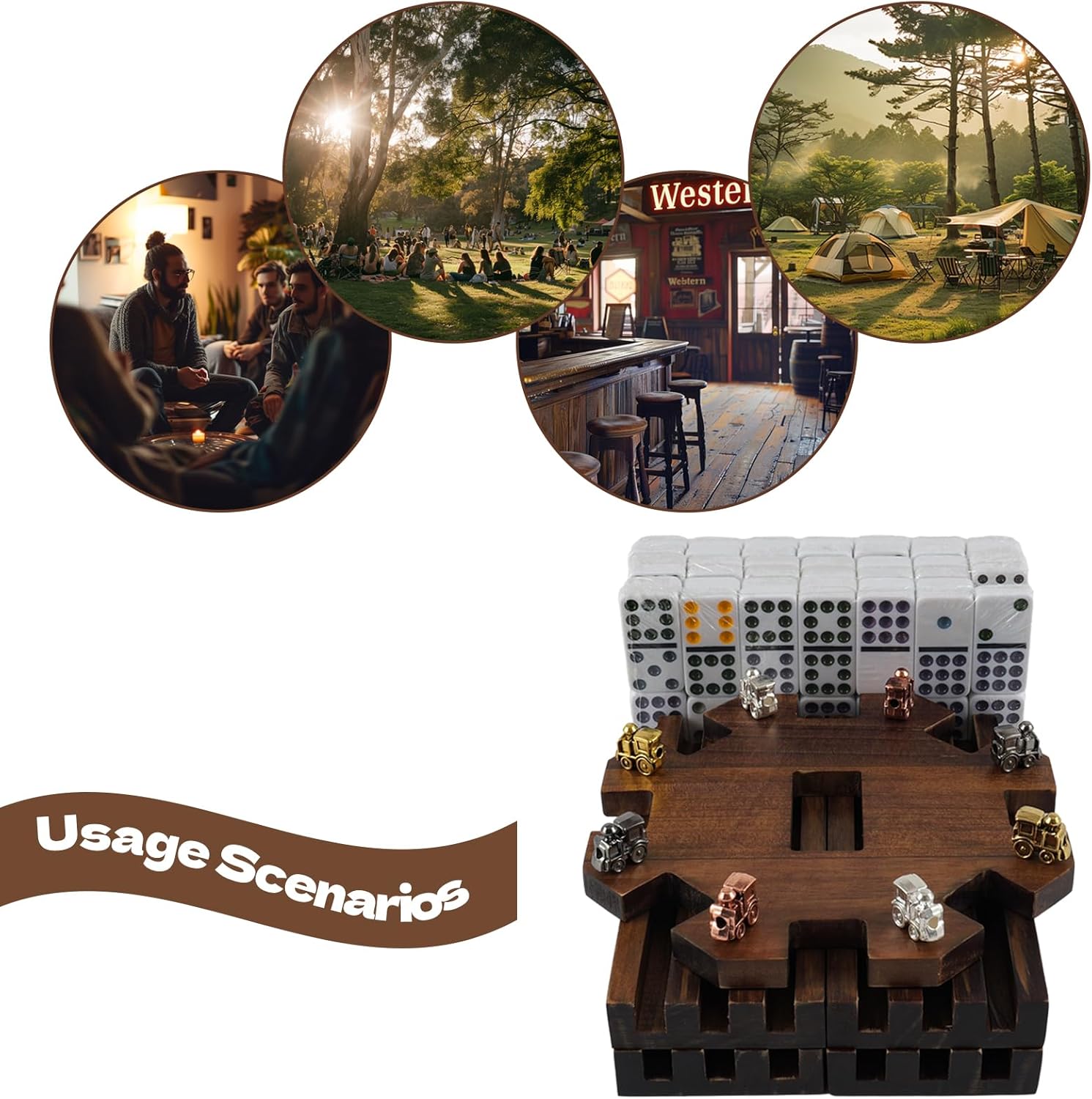 - 【Carefully Crafted With High-Quality Materials】Our dominoes are well made and printed with bright colored dots. The wheel hub and tile rack are both made of solid wood, covered with vintage colors, and sturdy and durable. We have also prepared cute metal train markers for you to play with better. Compared to other plastic trains and plastic boards on the market, our product is more exquisite and reliable in quality. We have also specially designed color box packaging to facilitate your storage and preservation.