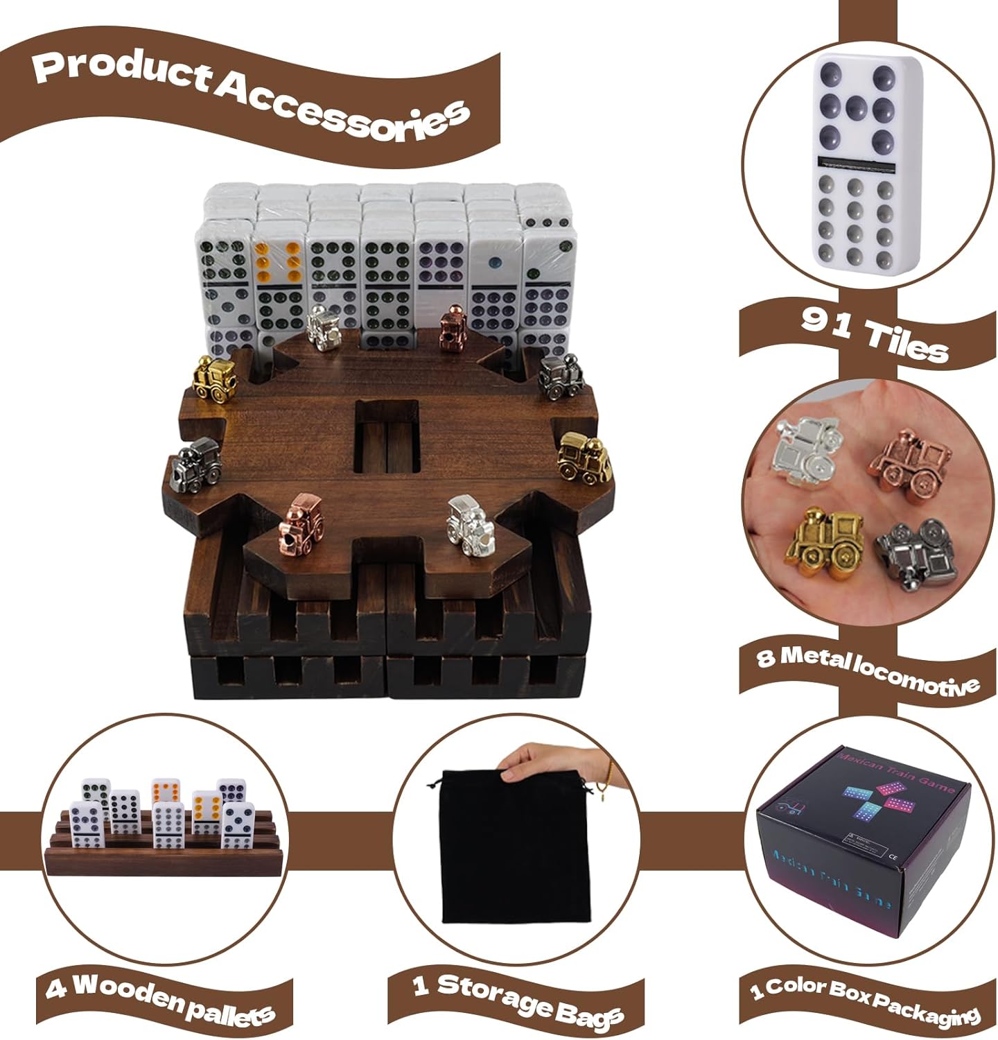 - 【Luxurious Mexican Train Dominoes Set】This Mexican train domino set comes with everything you need to spend quality time with family and friends, including 91 classic double-layer tiles, 8 metal trains,1 storage bag, 1 wooden wheel hub, 4 wooden tile racks and a game manual. The size of each domino is 1.93x0.98x0.39 inches, making it easy to operate and play. All of these will be packed into a color box (8.46 * 7.95 * 4.72 inches) and delivered to you.