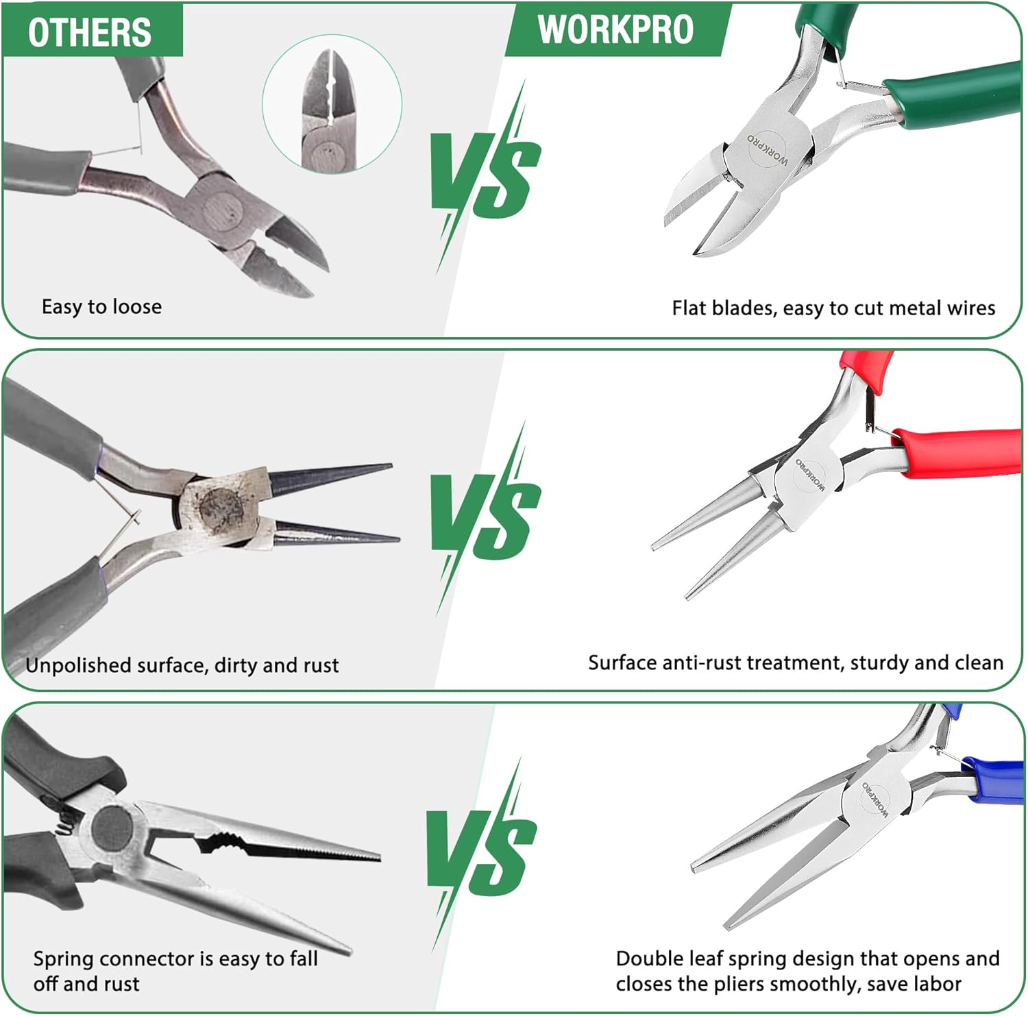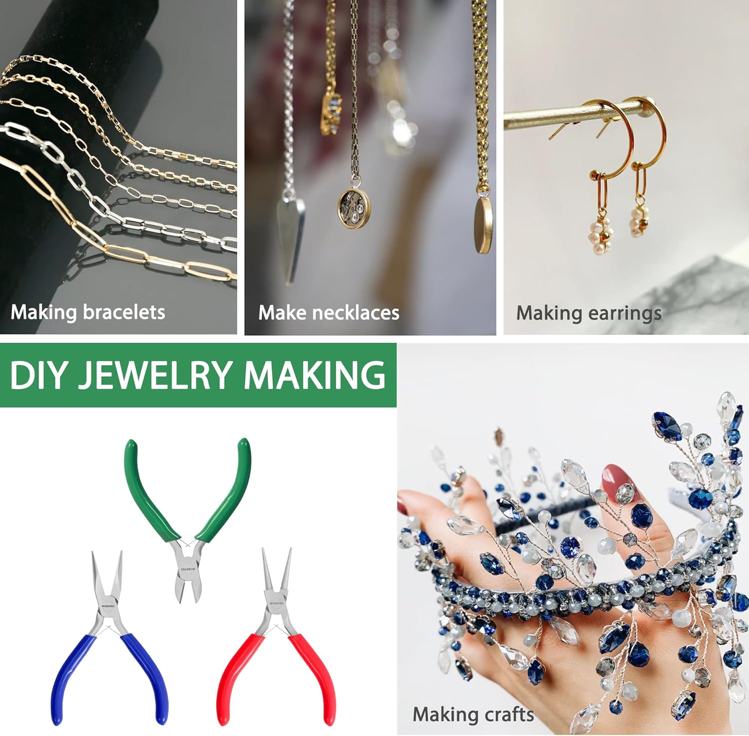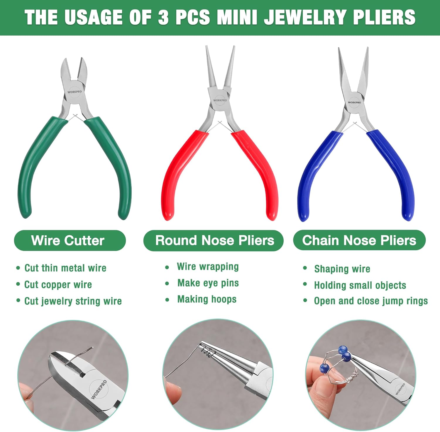 - COMPLETE JEWELRY MAKING KIT: This set of 3 small jewelry pliers is an ideal tool for charm necklaces, beading, jewelry repair, wire wrapping, and rosary making. It's suitable for both beginners and professionals and makes a great gift for DIY enthusiasts and craft lovers. With these high-quality WORKPRO jewelry making tools, you'll be able to create beautiful jewelry pieces with ease