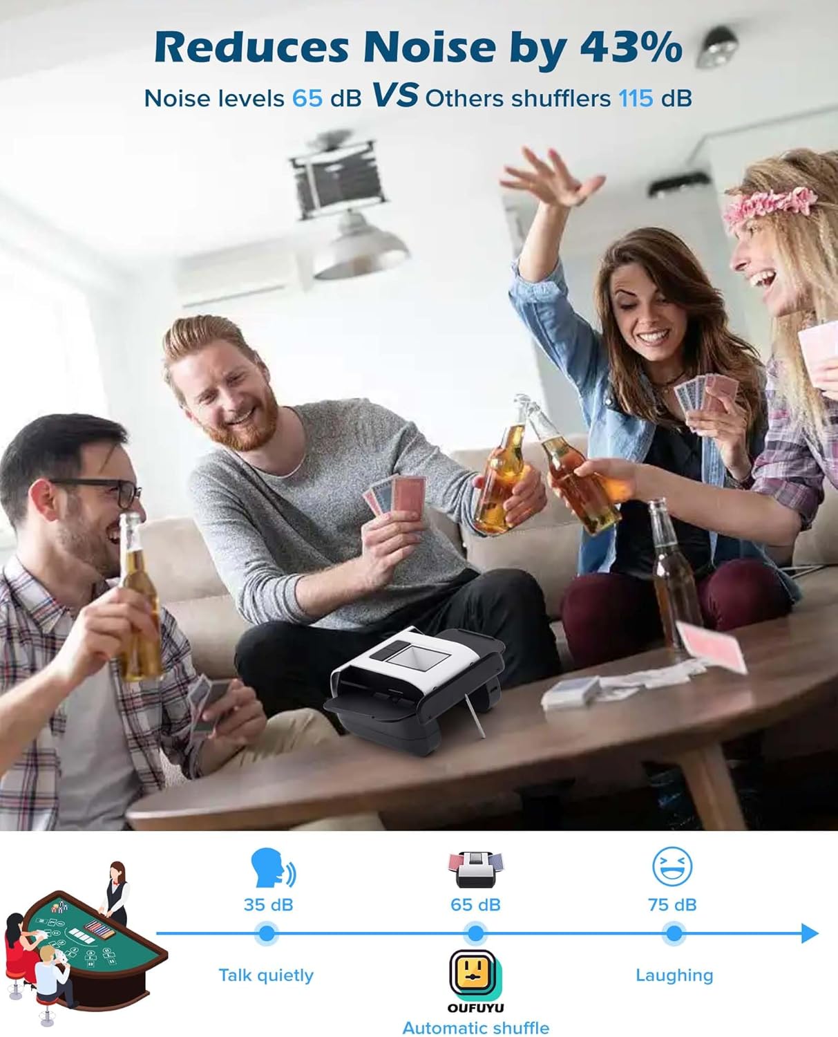- ONE-PRESS SHUFFLING : OUFUYU automatic card shuffler starts automatic shuffling with just one press of the AUTO button, and the built-in smart sensor detects the cards and stops accurately when the shuffling is complete