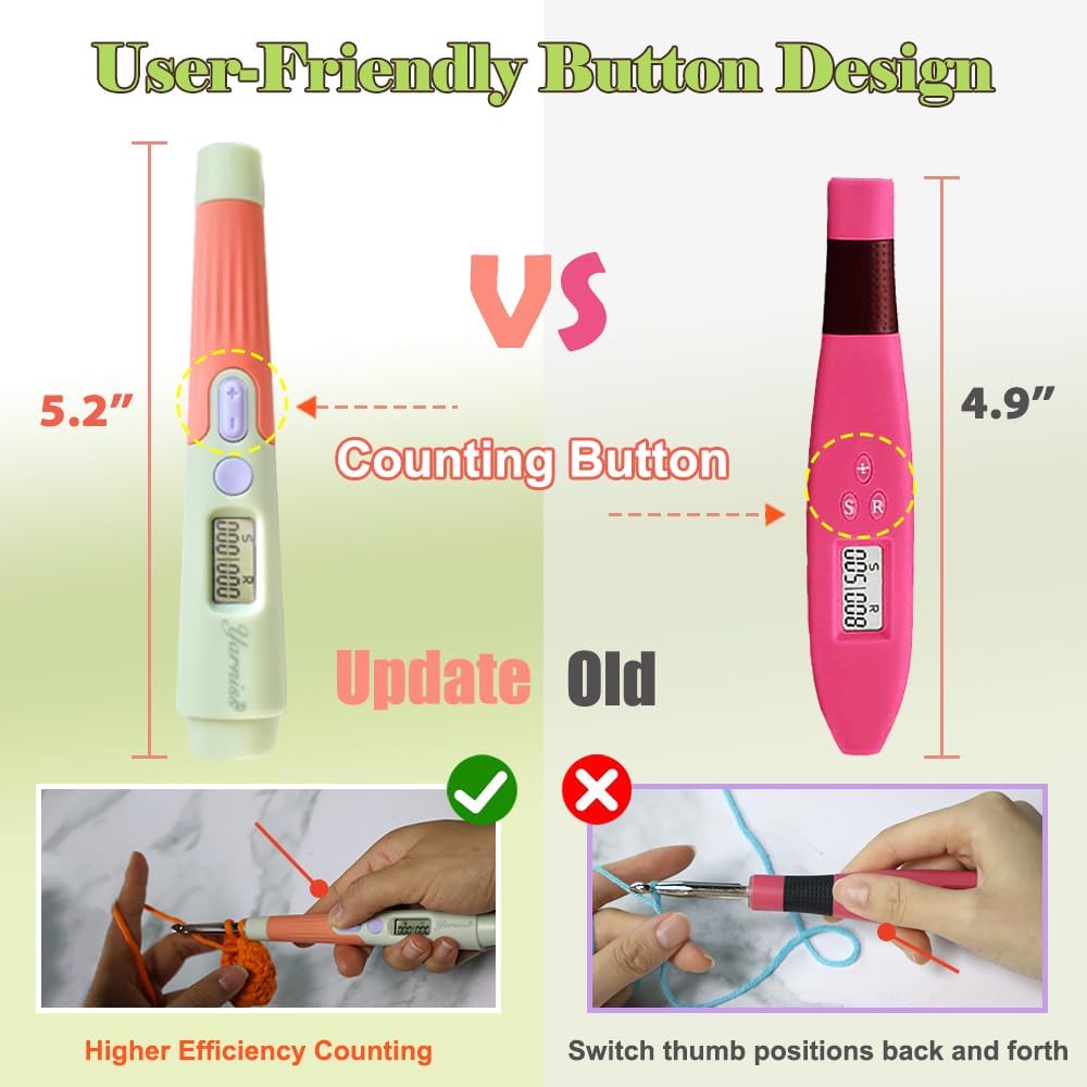 - Ergonomic & User-Friendly Counting - Engineered with your comfort in mind, the counting buttons are strategically placed right under your thumb. This means no more awkward hand movements or stretching to the end of the handle to count. Just a gentle tap of your thumb and the count is updated instantly, allowing you to maintain your crocheting rhythm without interruption.