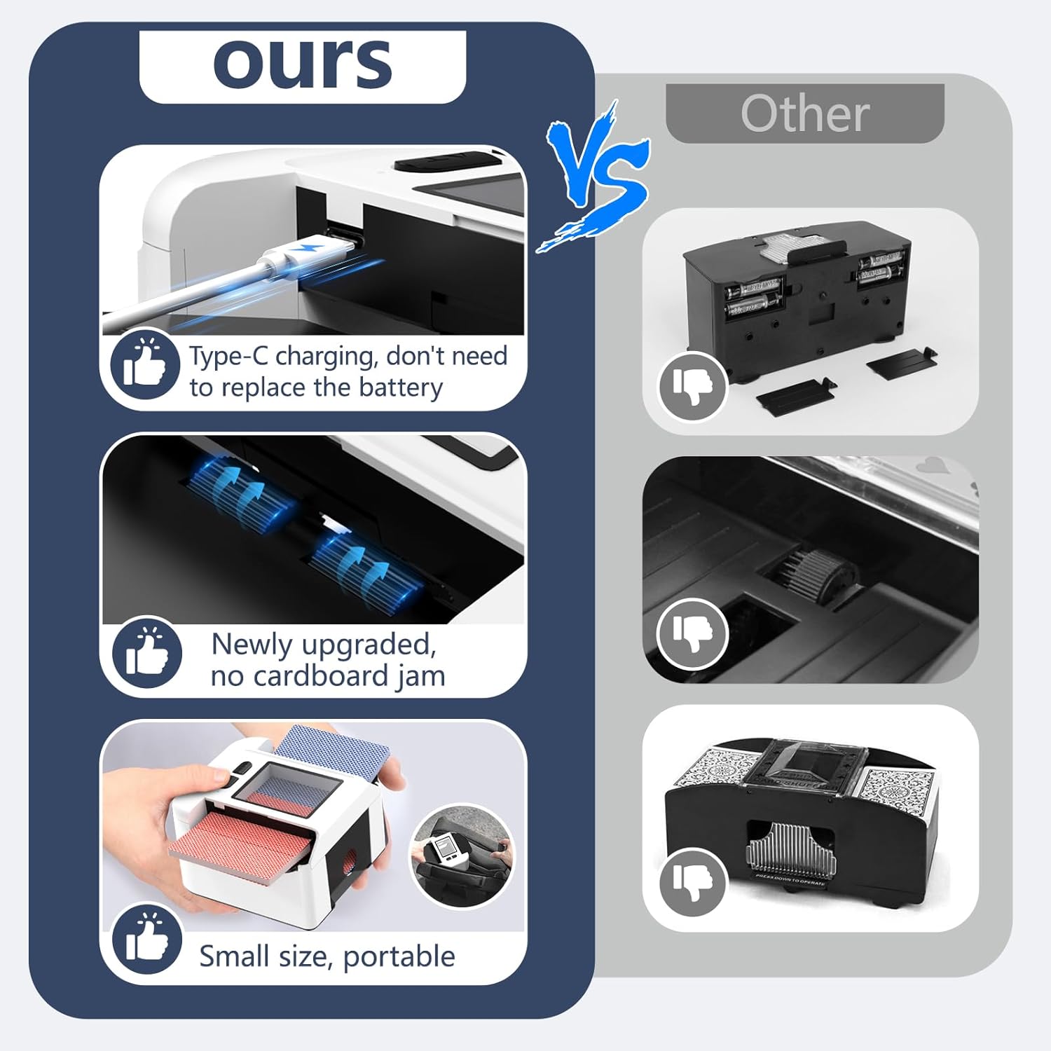 - Compact & Convenient: Newly upgraded electric card shuffler is made of high-quality materials, compact and convenient, you can enjoy it during family reunion, friends gathering or camping trip, etc. The simple operation is also ideal for the elderly, bringing them different gaming experience!