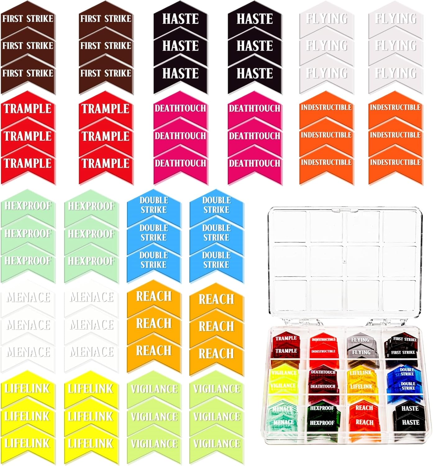 - HUGE 72 PCS SET PACKAGE INCLUDED: 72 pieces Metal Tokens, with 12 different colors, including 6pcs brown FIRST STRIKE, 6pcs black HASTE, 6pcs silver FLYING, 6pcs red TRAMPLE, 6pcs pink DEATHTOUCH, 6pcs orange INDESTRUCTIBLE, 6pcs green HEXPROOF, 6pcs blue DOUBLE STRIKE, 6pcs transparency MENACE, 6pcs light orange REACH, 6pcs yellow LIFELINK, 6pcs light green VIGILANCE, total 72 pieces in transparency case.