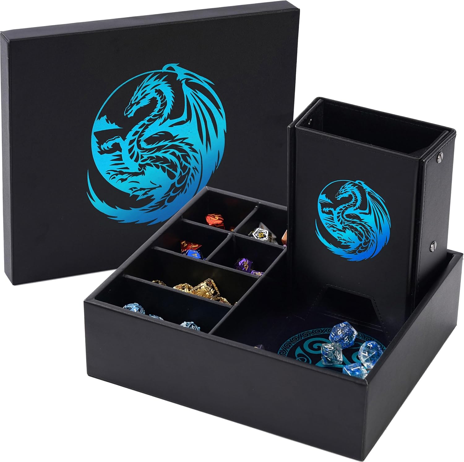 - READY TO ROLL, ANYWHERE, ANYTIME: With two dice trays (the lid serves as an extra tray), a large tower, and efficient storage space - our All-in-One Game Roamer set is the ultimate portable RPG gaming companion. Adorned with exquisite artwork and built to last, this dice roller tray and tower box elegantly ensures all your gaming essentials are organized, protected, and ready for every gaming adventure