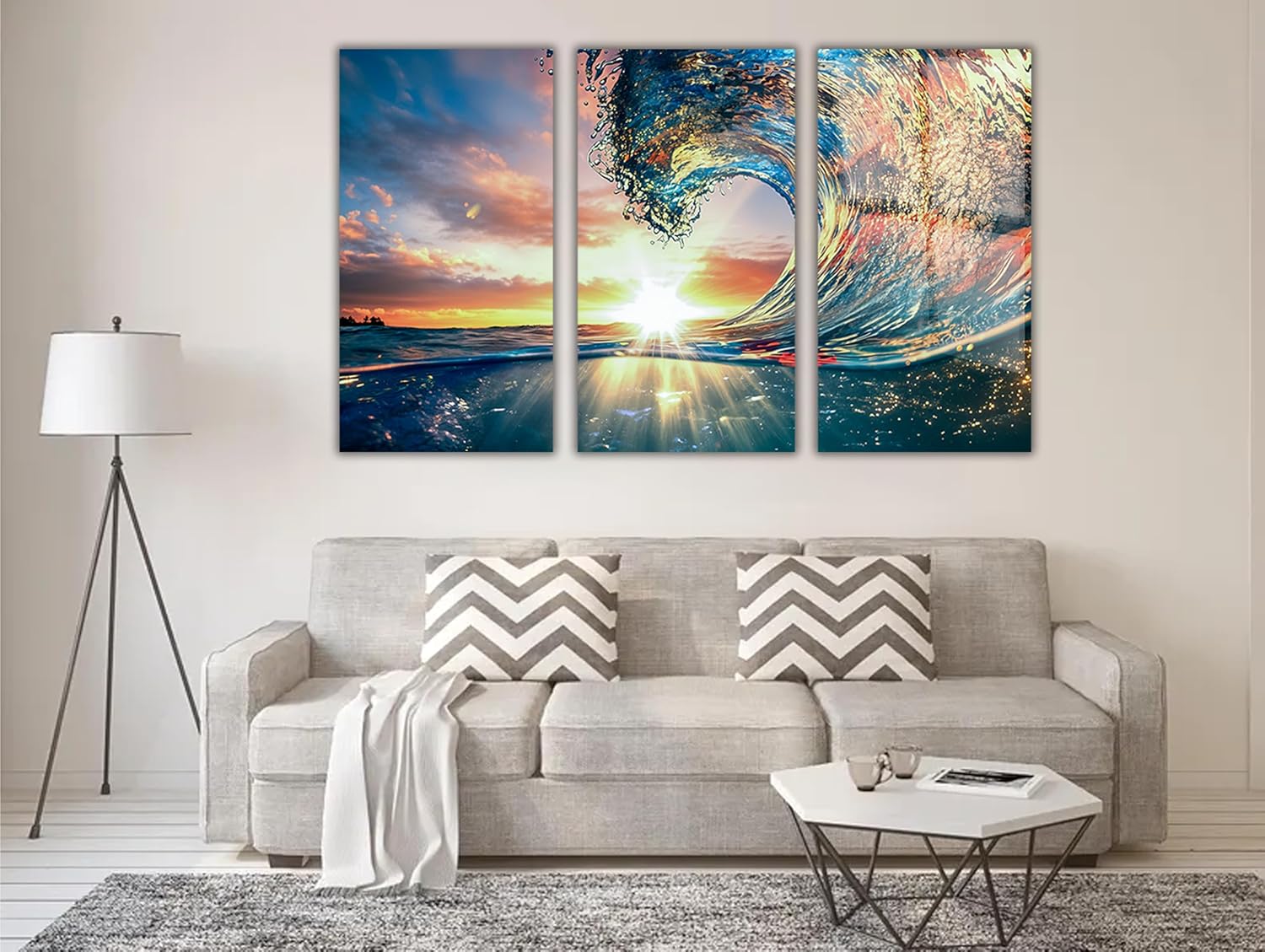SpiritualHands Shining Sun and Waves Printed Tempered Glass Wall Art Painting for Living Room, Tempered Glass Modern Prints Decor, Large Vivid Color Panel for Bedroom, Kitchen, or Office