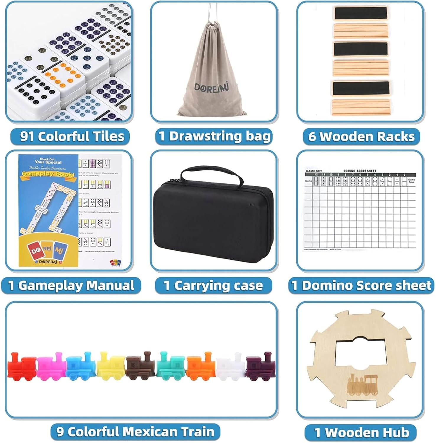 - 8 in 1 Mexican Dominoes Set: This dominoes Set is designed with 91 dot domino tiles, 6 wooden trays, 1 EVA case,1 drawstring bag, 9 trains, 1 game manual, 1 scorebook and 1 hub. The domino tiles are finely polished up to 5 times for shiny surfaces