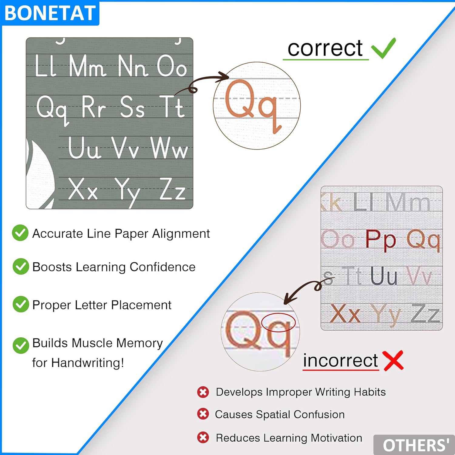 - School-Standard Letter Design: Every alphabet follows "proper line paper guidelines" – uppercase letters touch the top line, lowercase letters fit between midlines. Teaches correct stroke order and prevents common reversals (b/d/p/q). Give Your Child a Head Start in Handwriting!