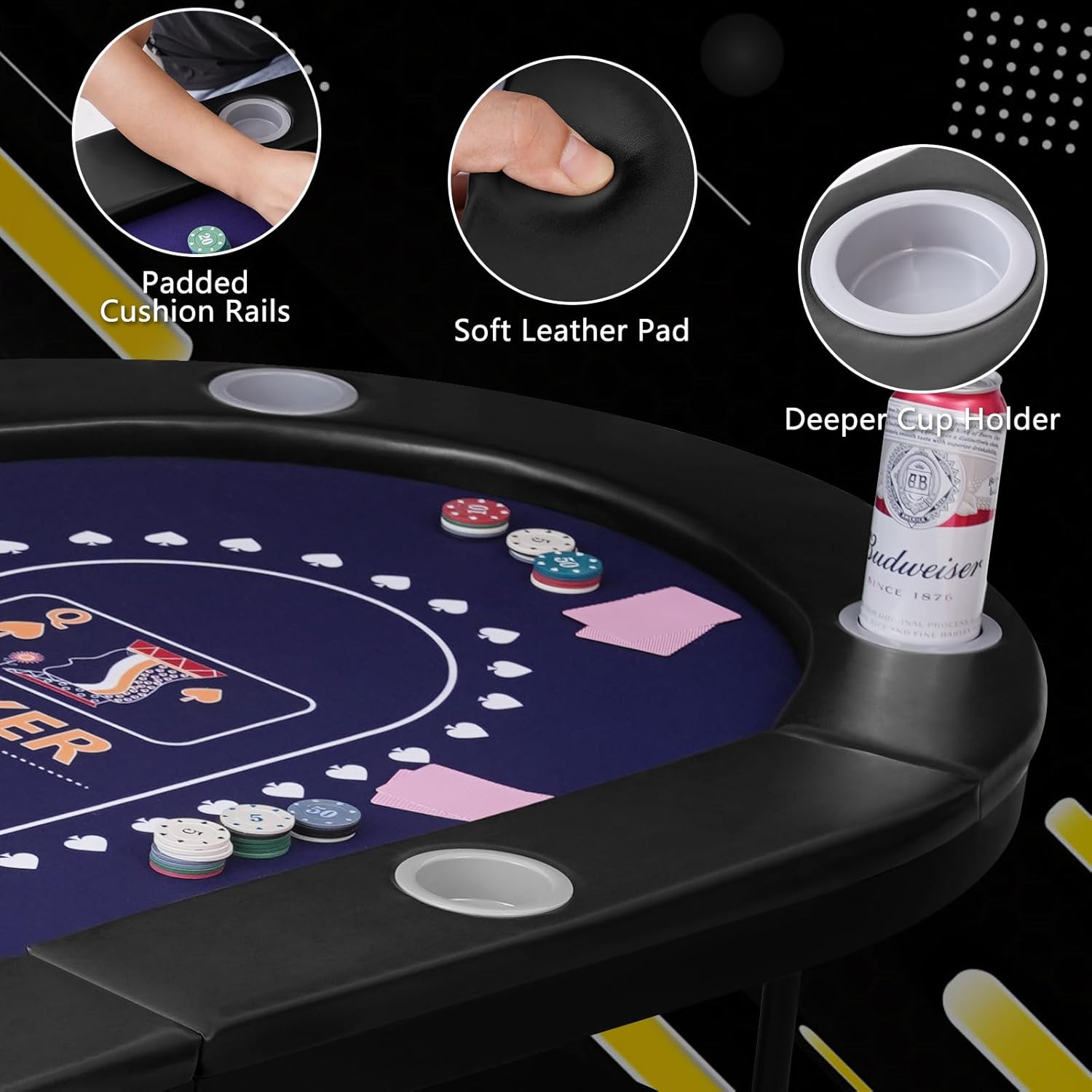 - 8 Player Poker Table: Designed for Texas Hold’em, Blackjack, and other card games, this foldable poker table is 71"L x 35.5"W x 30"H and can accommodate 8 players, making it perfect for family game nights, friendly tournaments, or casino-themed parties.