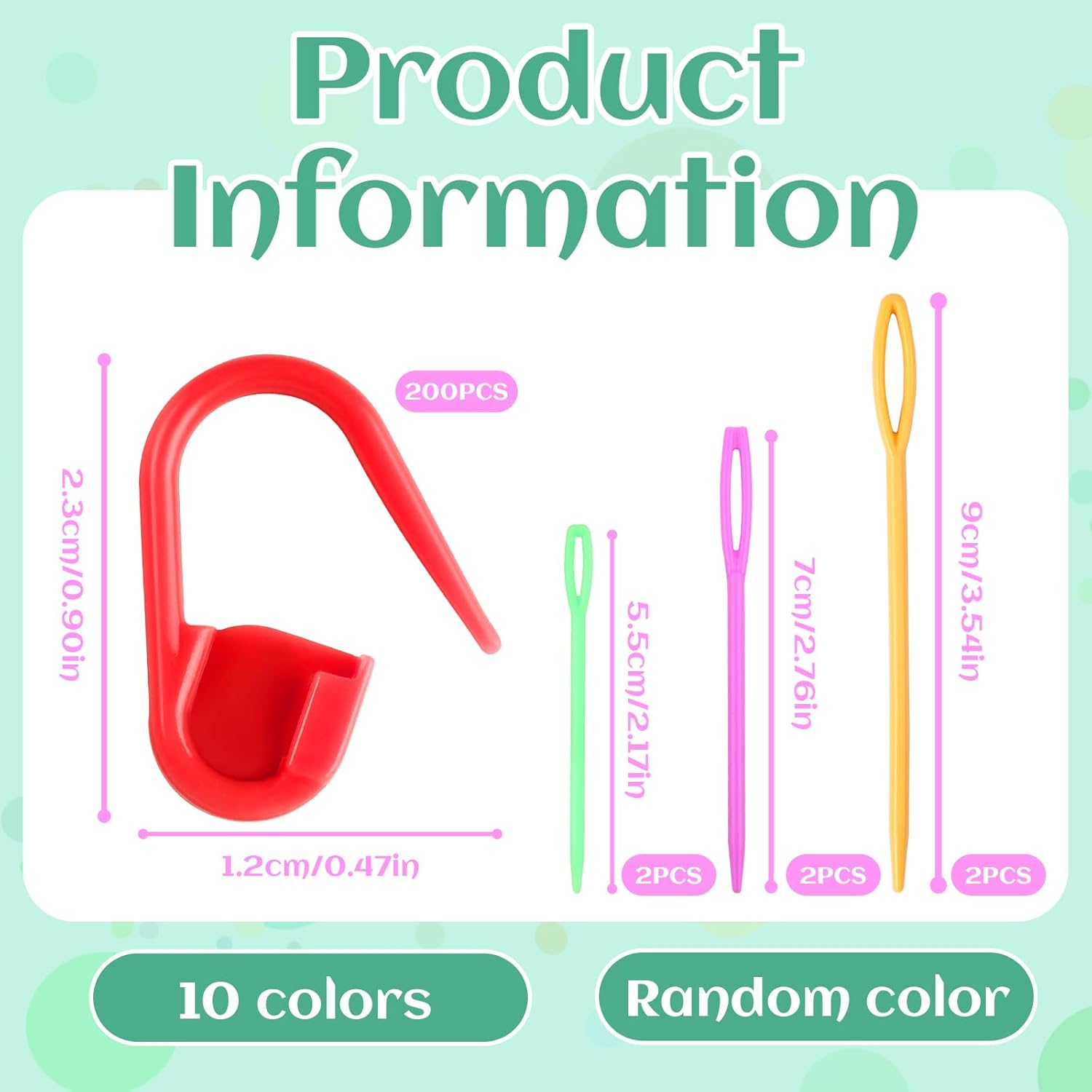 - Included Components : 200 plastic stitch needle clips (10 colors), 6 big eye plastic yarn needles, 1 storage box