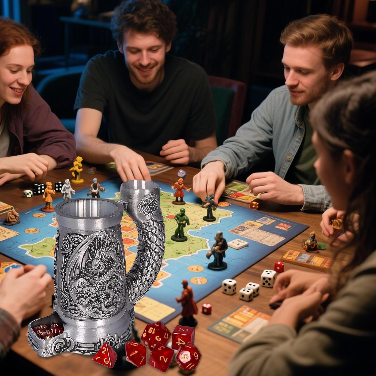 Dice Tower Mug, Dice Rolling Tower, Comes with 7 PCS Dice Set, Suitable for DND Dungeons and Dragons, Tabletop Games, Available As Drink Holder, D&D Gifts, DND Accessories (Silver-Dragon)