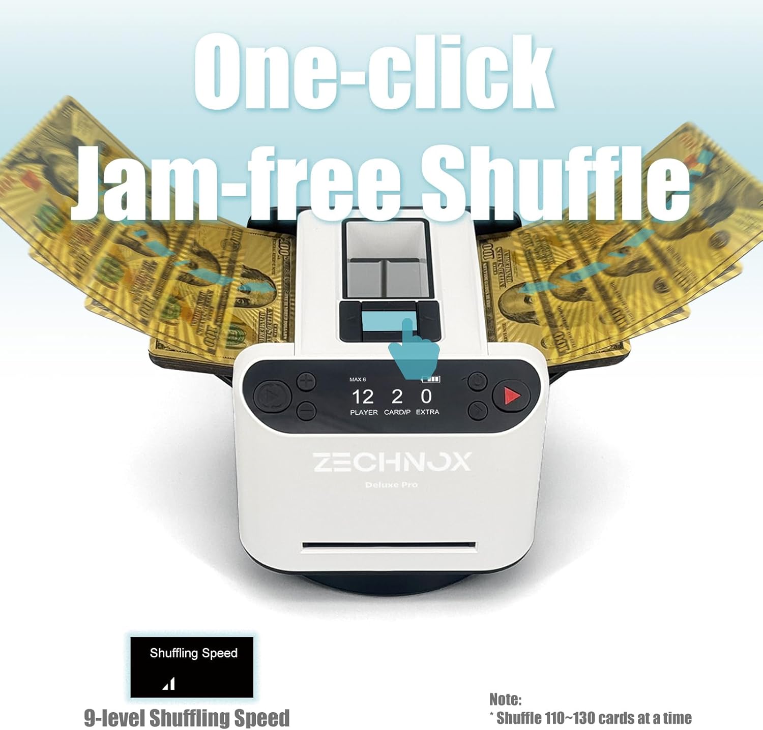 - 【2-in-1 Smart Shuffle and Deal】: -Advanced tech combines card shuffling and dealing in one smart device,ensuring smooth gameplay for up to 12 players; -Save setup time and enjoy more game time,with an easy-to-follow user manual for a quick learning curve; -The robot processing ensures fairness and accuracy in the game