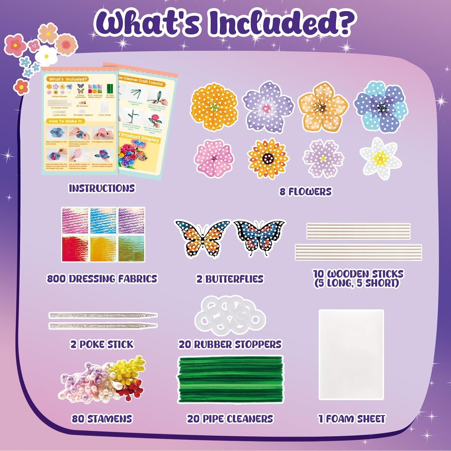 - [Creative Poke in Art]: This arts and crafts for kids have 800 fabric squares, 80 stamens, 8 flowers, 2 butterflies, 10 wooden stems (5 long, 5 short), 2 poke-in sticks, 20 pipe cleaners, and instructions. Children use “point pressing” to insert cloth pieces into the flower board, freely creating bouquets and enjoying a relaxing craft activity. Extra pipe cleaners allow kids to make 3D leaves, vines, and other decorations for more creative possibilities