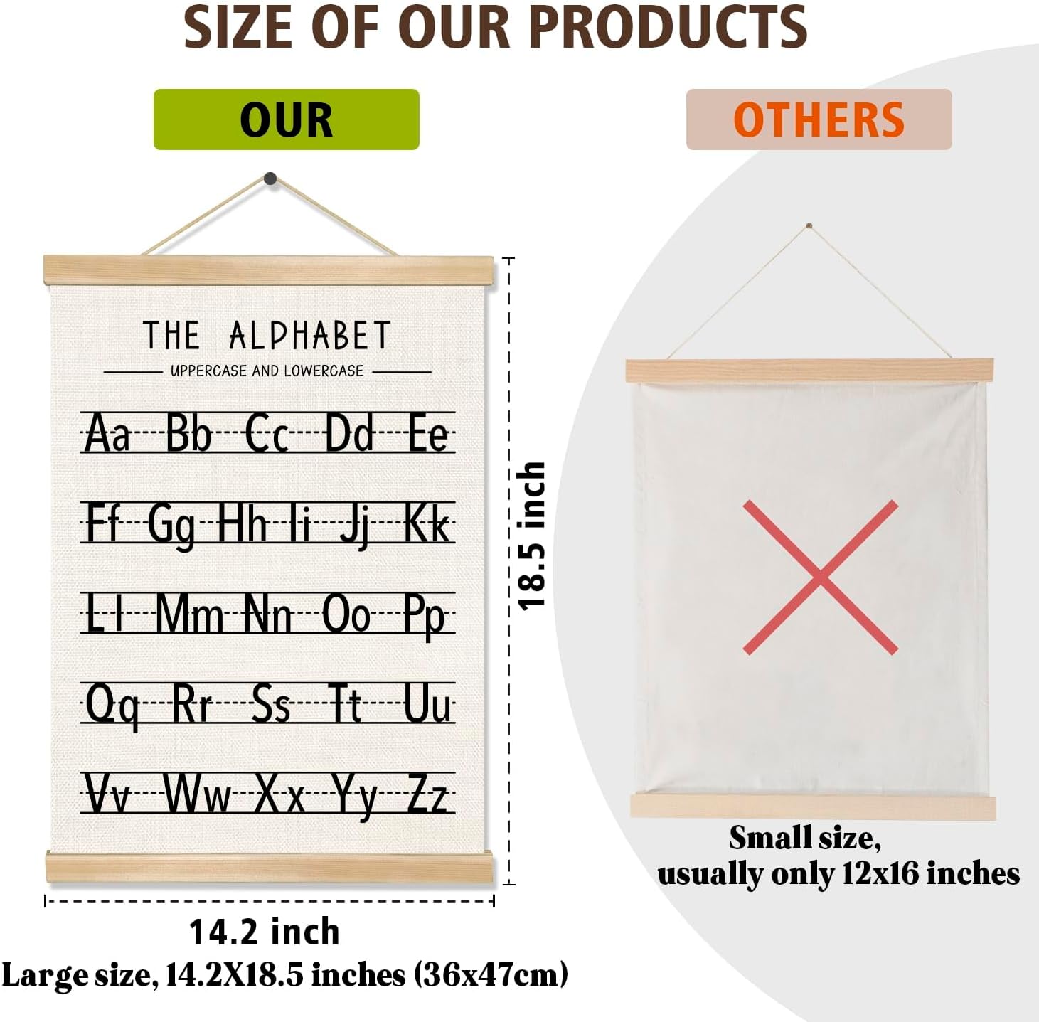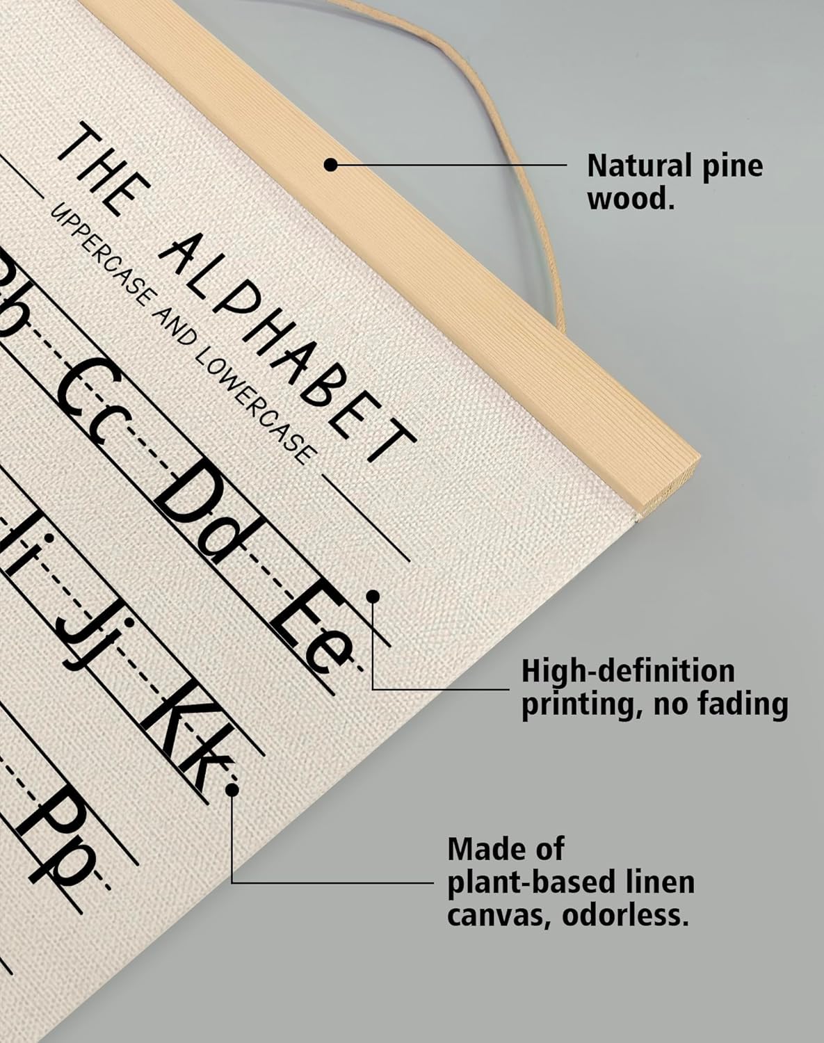 - Material & Ideal Size:Natural Linen,14 x 18.5 inches, Set of 2,one alphabet poster and one numbers 1–20 chart ,a full learning combo.These alphabet and number posters are printed on premium natural linen fabric, giving a rustic yet elegant texture.