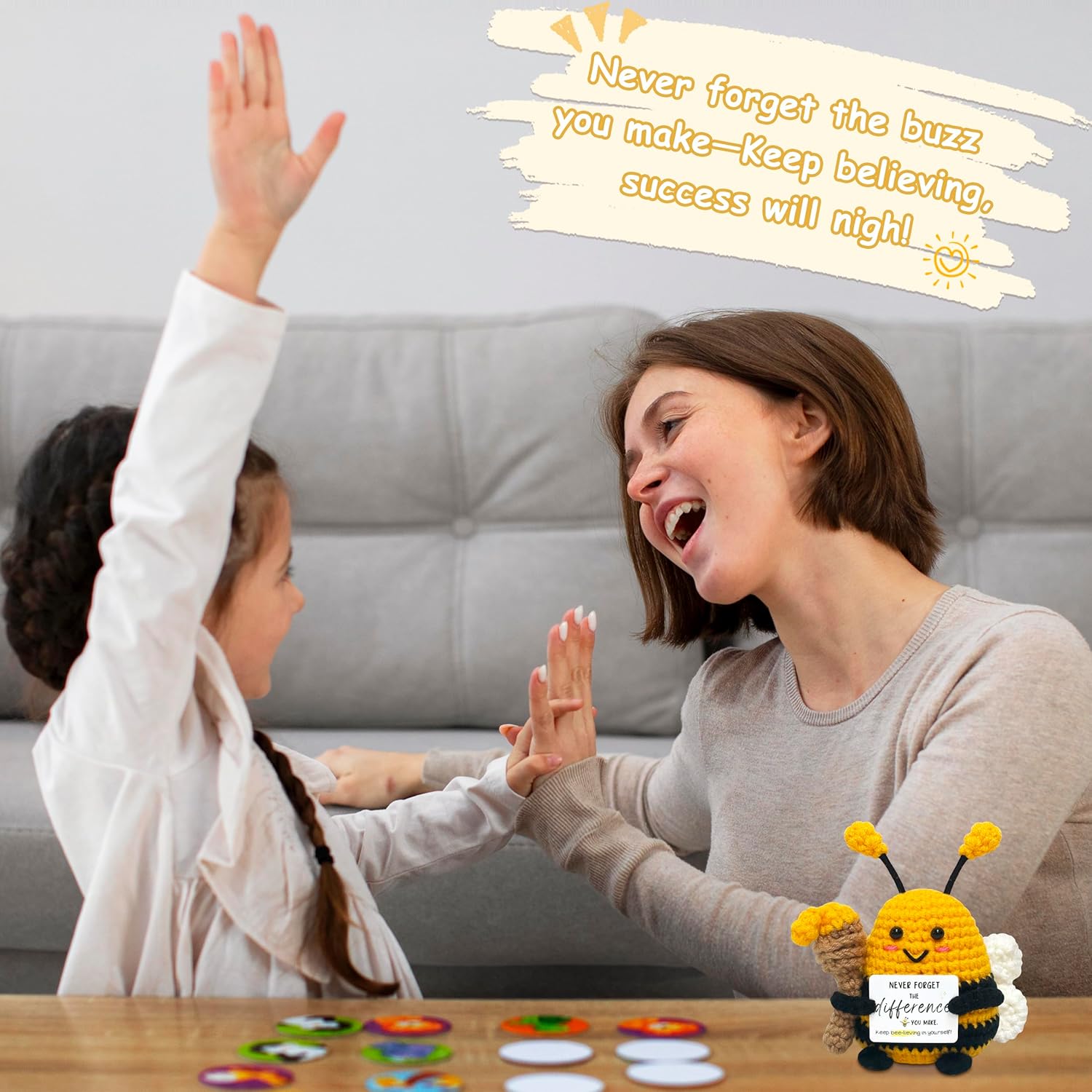 - Inspirational Crochet Bee Gifts: This hand-stitched crochet bee comes with a sweet reminder card: "NEVER FORGET THE difference YOU MAKE. Keep bee-lieving in yourself." Carry it with you or keep it on your desk—whenever you need a boost, this charming bee and its heartfelt message will inspire you to stay positive and tackle each day with enthusiasm. Perfect for bee lovers or anyone who needs a daily dose of positivity
