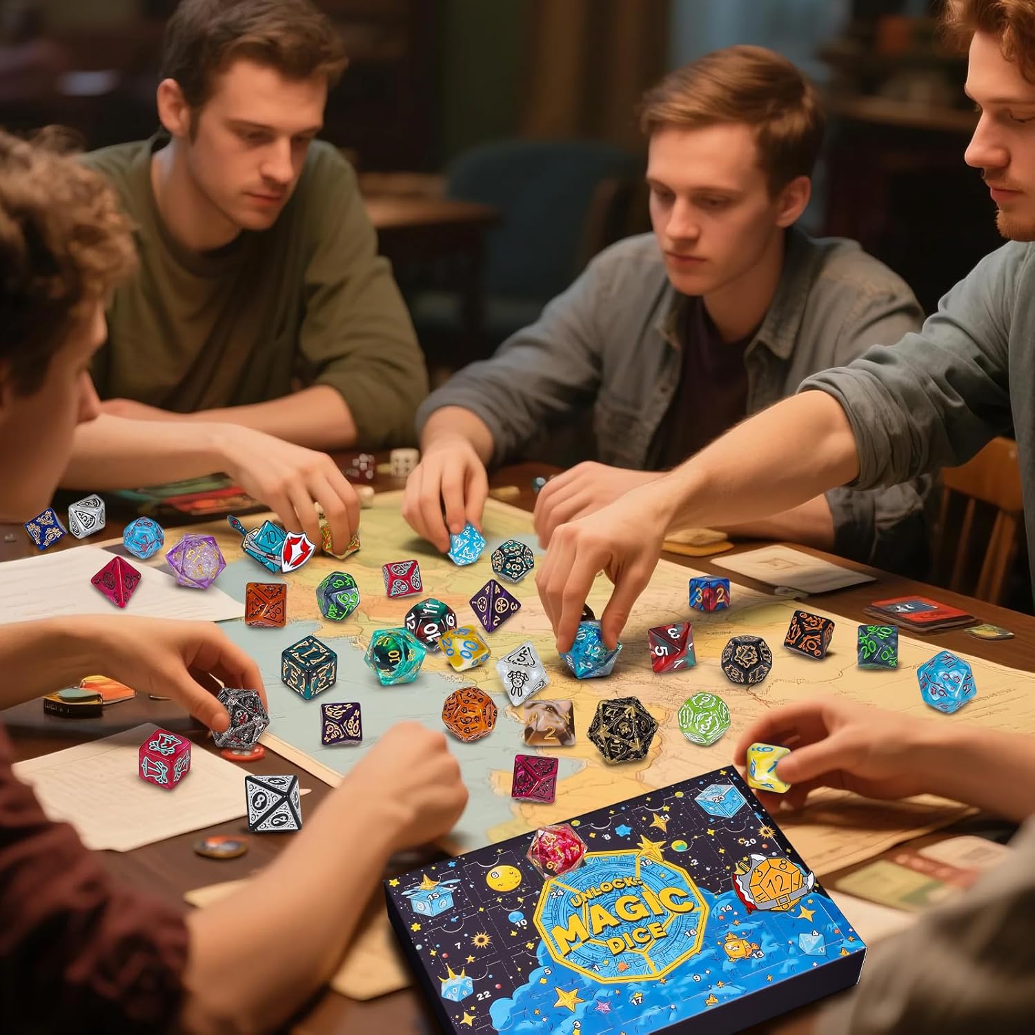 - DND Gift Box: Every hole in the box has surprises, random polyhedral dice & pins; total 21 individual dice (random style polyhedral dice) + 1 random pins badges + 2 unique D20 dice.