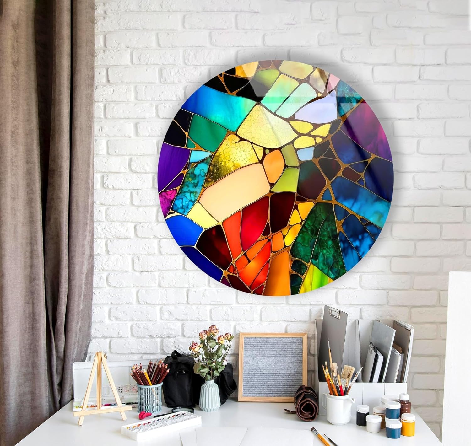 My Photostation.com 27.5''(70cm) Diameter Multicolor Round Stained Glass Wall Art Vibrant Mosaic Abstract Panel Tempered Glass Printing Wall Decor Large Wall Art Wall Hangings