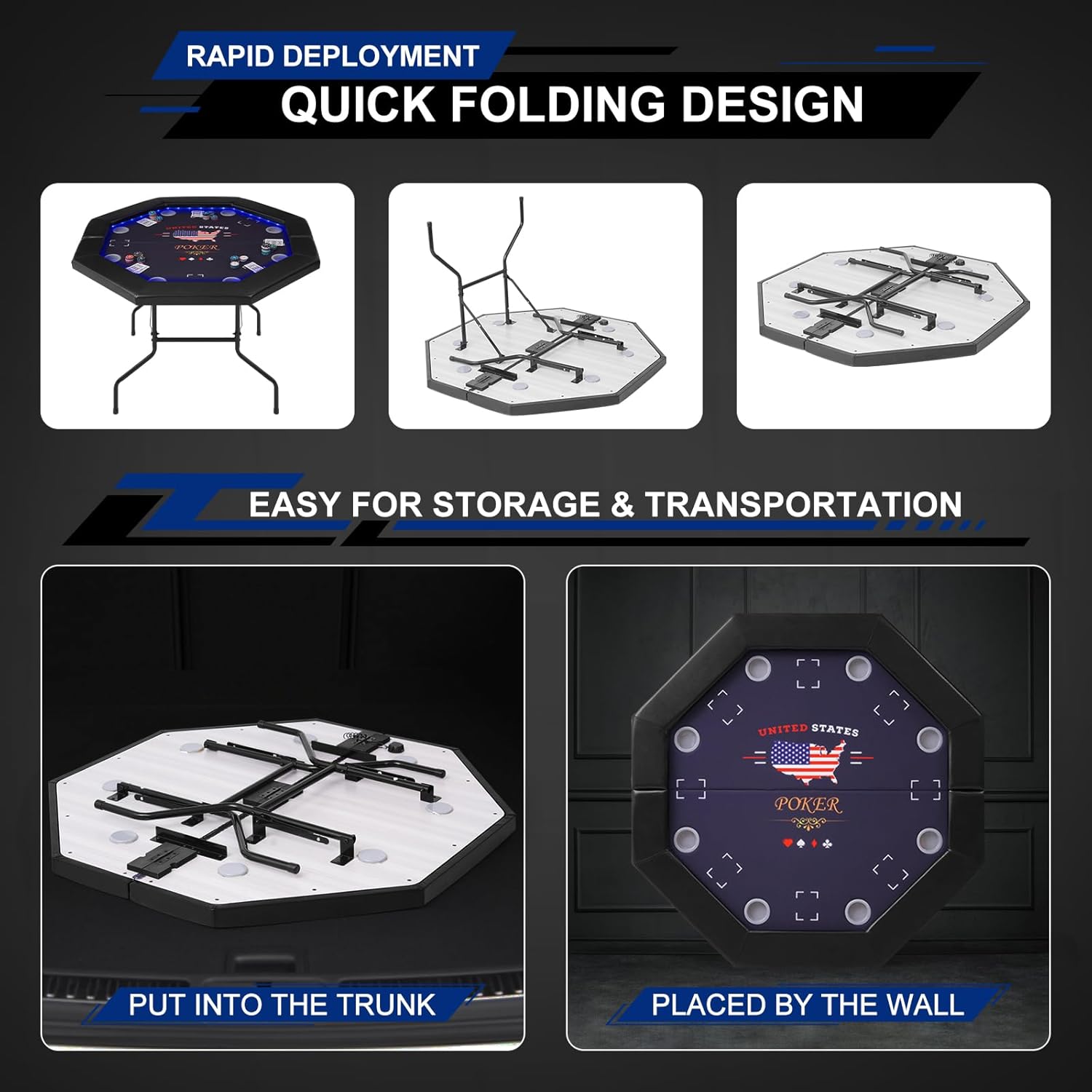 - ULTIMATE POKER NIGHT: Our foldable poker table can accommodate 6-8 player for card games such as blackjack, Texas Hold'em or gambling. The versatile Texas Holdem table is suitable for family nights, parties, events, outdoor picnics, camping, and gatherings. Portable poker table provides leisure time for you and your friends