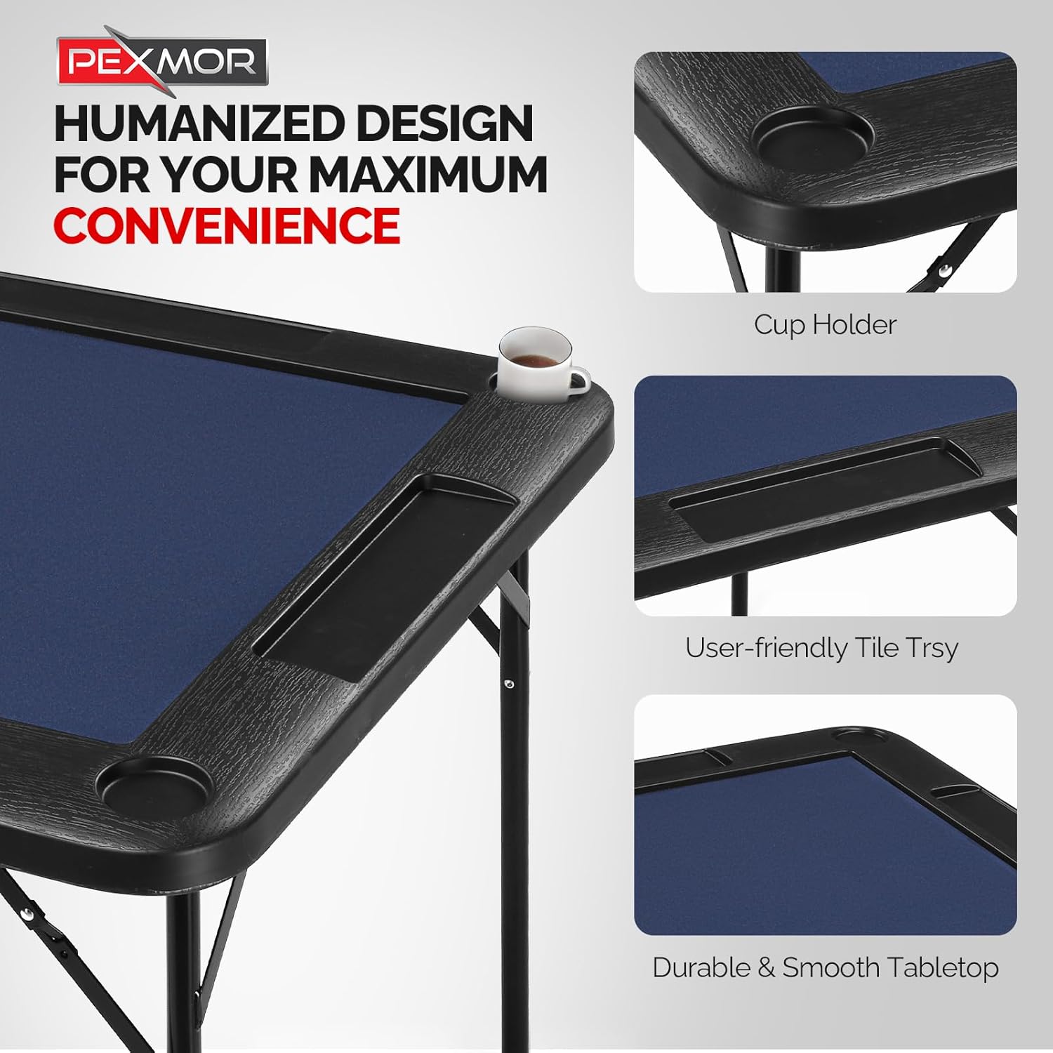PEXMOR 35" Foldable Mahjong Table, 4 Player Card Game Table w/Cup Holders & Chip Grooves, Portable Folding Poker Domino Board Game Table for Blackjack, Texas Hold'em, Jigsaw Puzzles Game (Blue, 35")
