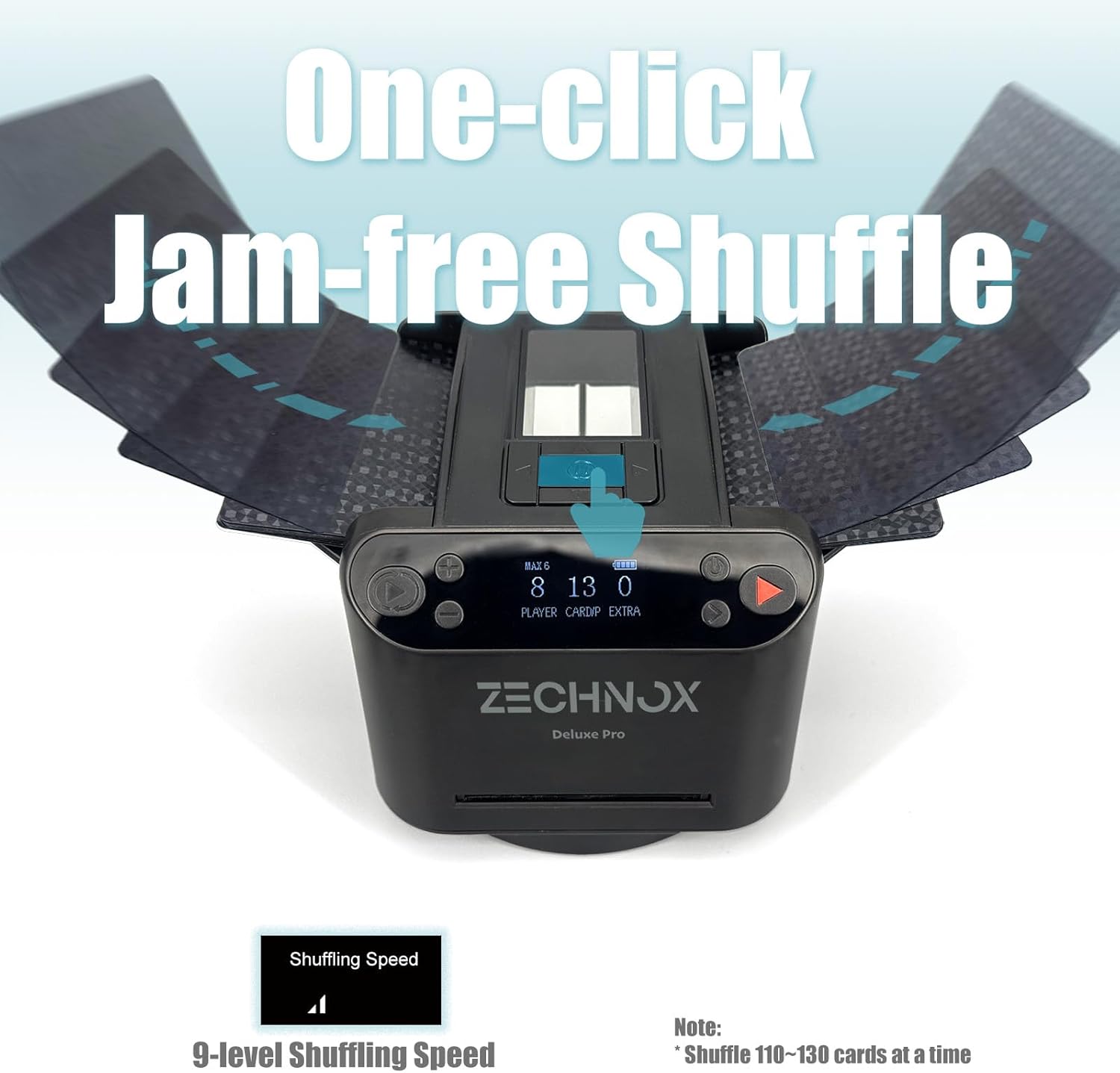 - 【Jam-free Shuffling in 5 sec】: It's able to Shuffle Two Decks at the same time at adjustable shuffling speed,hold max 108 cards;Consecutive shuffles allowed, max 792 cards to deal in one game
